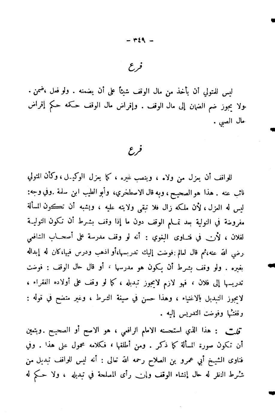 قُلْتُ: هَذَا الَّذِي اسْتَحْسَنَهُ الْإِمَامُ الرَّافِعِيُّ، هُوَ الْأَصَحُّ، أَوِ الصَّحِيحُ، وَيَتَعَيَّنُ أَنْ تَكُونَ صُورَةُ الْمَسْأَلَةِ كَمَا ذَكَرَ، وَمَنْ أَطْلَقَهَا، فَكَلَامُهُ مَحْمُولٌ عَلَى هَذَا، وَفِي فَتَاوَى الشَّيْخِ أَبِي عَمْرِو بْنِ الصَّلَاحِ - رَحِمَهُ اللَّهُ تَعَالَى -: أَنَّهُ لَيْسَ لِلْوَاقِفِ تَبْدِيلٌ مِنْ شَرْطِ النَّظَرِ لَهُ حَالَ إِنْشَاءِ الْوَقْفِ، وَإِنْ رَأَى الْمَصْلَحَةَ فِي تَبْدِيلِهِ، وَلَا حُكْمَ لَهُ