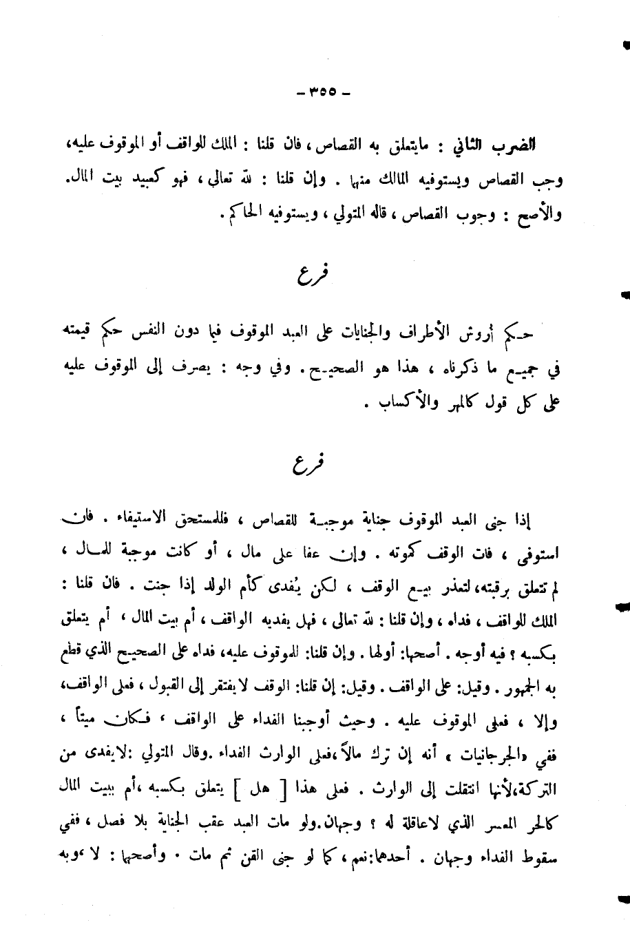 الضَّرْبُ الثَّانِي: مَا يَتَعَلَّقُ بِهِ الْقِصَاصُ، فَإِنْ قُلْنَا: الْمِلْكُ لِلْوَاقِفِ، أَوِ الْمَوْقُوفِ عَلَيْهِ وَجَبَ الْقِصَاصُ وَيَسْتَوْفِيهِ الْمَالِكُ مِنْهُمَا. وَإِنْ قُلْنَا: لِلَّهِ تَعَالَى، فَهُوَ كَعَبِيدِ بَيْتِ الْمَالِ. وَالْأَصَحُّ: وُجُوبُ الْقِصَاصِ، قَالَهُ الْمُتَوَلِّي، وَيَسْتَوْفِيهِ الْحَاكِمُ.