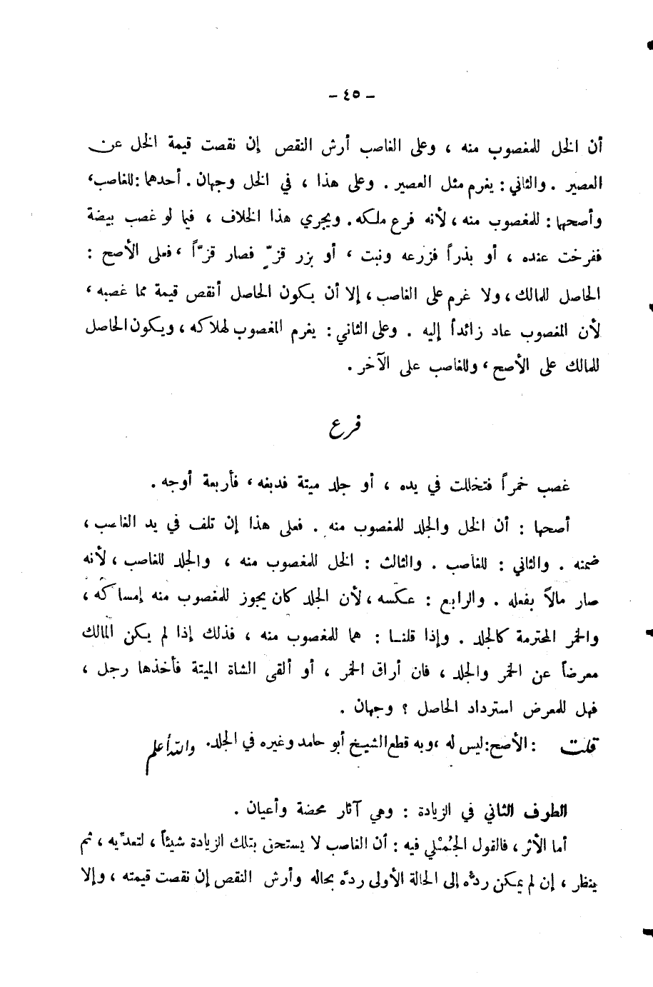 أَنَّ الْخَلَّ لِلْمَغْصُوبِ مِنْهُ، وَعَلَى الْغَاصِبِ أَرْشُ النَّقْصِ إِنْ نَقَصَتْ قِيمَةُ الْخَلِّ عَنِ الْعَصِيرِ. وَالثَّانِي: يَغْرَمُ مِثْلَ الْعَصِيرِ. وَعَلَى هَذَا فِي الْخَلِّ وَجْهَانِ. أَحَدُهُمَا: لِلْغَاصِبِ، وَأَصَحُّهُمَا: لِلْمَغْصُوبِ مِنْهُ، لِأَنَّهُ فَرْعُ مِلْكِهِ. وَيَجْرِي هَذَا الْخِلَافُ، فِيمَا لَوْ غَصَبَ بَيْضَةً فَفَرَّخَتْ عِنْدَهُ، أَوْ بَذْرًا فَزَرَعَهُ وَنَبَتَ، أَوْ بَذْرَ قَزٍّ فَصَارَ قَزًّا، فَعَلَى الْأَصَحِّ: الْحَاصِلُ لِلْمَالِكِ، وَلَا غُرْمَ عَلَى الْغَاصِبِ، إِلَّا أَنْ يَكُونَ الْحَاصِلُ أَنْقَصَ قِيمَةً مِمَّا غَصَبَهُ، لِأَنَّ الْمَغْصُوبَ عَادَ زَائِدًا إِلَيْهِ. وَعَلَى الثَّانِي: يَغْرَمُ الْمَغْصُوبَ لِهَلَاكِهِ، وَيَكُونُ الْحَاصِلُ لِلْمَالِكِ عَلَى الْأَصَحِّ، وَلِلْغَاصِبِ عَلَى الْآخَرِ. فَرْعٌ غَصَبَ خَمْرًا فَتَخَلَّلَتْ فِي يَدِهِ، أَوْ جِلْدَ مَيْتَةٍ فَدَبَغَهُ، فَأَرْبَعَةُ أَوْجُهٍ. أَصَحُّهَا: أَنَّ الْخَلَّ وَالْجِلْدَ لِلْمَغْصُوبِ مِنْهُ. فَعَلَى هَذَا إِنْ تَلِفَ فِي يَدِ الْغَاصِبِ ضَمِنَهُ. وَالثَّانِي: لِلْغَاصِبِ. وَالثَّالِثُ: الْخَلُّ لِلْمَغْصُوبِ مِنْهُ، وَالْجِلْدُ لِلْغَاصِبِ، لِأَنَّهُ صَارَ مَالًا بِفِعْلِهِ. وَالرَّابِعُ: عَكْسُهُ، لِأَنَّ الْجِلْدَ كَانَ يَجُوزُ لِلْمَغْصُوبِ مِنْهُ إِمْسَاكُهُ، وَالْخَمْرُ الْمُحْتَرَمَةُ كَالْجِلْدِ. وَإِذَا قُلْنَا: هُمَا لِلْمَغْصُوبِ مِنْهُ، فَذَلِكَ إِذَا لَمْ يَكُنِ الْمَالِكُ مُعْرِضًا عَنِ الْخَمْرِ وَالْجِلْدِ، فَإِنْ أَرَاقَ الْخَمْرَ، أَوْ أَلْقَى الشَّاةَ الْمَيِّتَةَ فَأَخَذَهَا رَجُلٌ، فَهَلْ لِلْمُعْرِضِ اسْتِرْدَادُ الْحَاصِلِ؟ وَجْهَانِ.