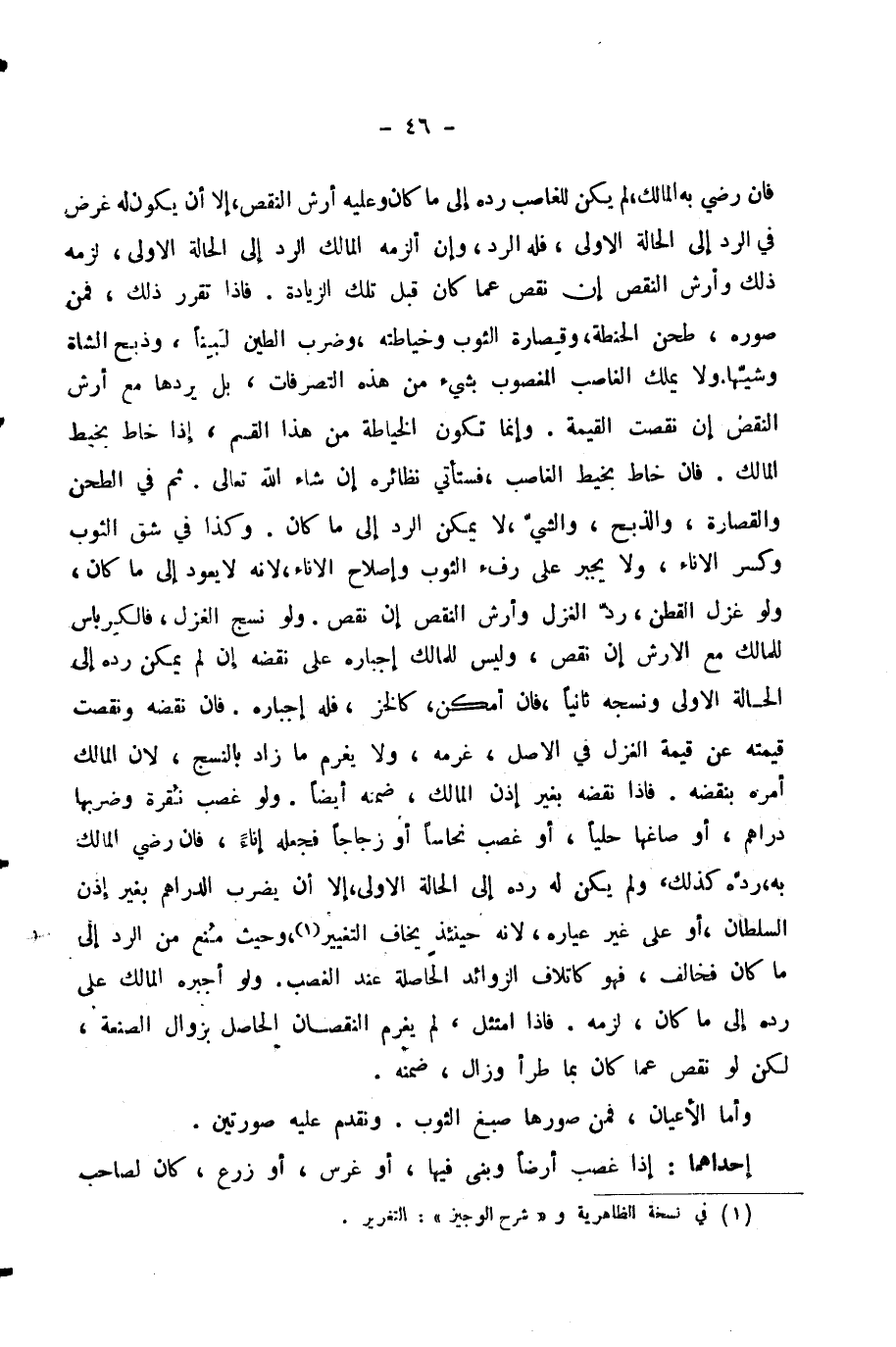 فَإِنْ رَضِيَ بِهِ الْمَالِكُ، لَمْ يَكُنْ لِلْغَاصِبِ رَدُّهُ إِلَى مَا كَانَ وَعَلَيْهِ أَرْشُ النَّقْصِ، إِلَّا أَنْ يَكُونَ لَهُ غَرَضٌ فِي الرَّدِّ إِلَى الْحَالَةِ الْأُولَى فَلَهُ الرَّدُّ، وَإِنْ أَلْزَمَهُ الْمَالِكُ الرَّدَّ إِلَى الْحَالَةِ الْأُولَى لَزِمَهُ ذَلِكَ وَأَرْشُ النَّقْصِ إِنْ نَقَصَ عَمَّا كَانَ قَبْلَ تِلْكَ الزِّيَادَةِ. فَإِذَا تَقَرَّرَ ذَلِكَ، فَمِنْ صُوَرِهِ طَحْنُ الْحِنْطَةِ، وَقِصَارَةُ الثَّوْبِ وَخِيَاطَتُهُ، وَضَرْبُ الطِّينِ لَبِنًا، وَذَبْحُ الشَّاةِ وَشَيُّهَا. وَلَا يَمْلِكُ الْغَاصِبُ الْمَغْصُوبَ بِشَيْءٍ مِنْ هَذِهِ التَّصَرُّفَاتِ، بَلْ يَرُدُّهَا مَعَ أَرْشِ النَّقْصِ إِنْ نَقَصَتِ الْقِيمَةُ. وَإِنَّمَا تَكُونُ الْخِيَاطَةُ مِنْ هَذَا الْقِسْمِ إِذَا خَاطَ بِخَيْطِ الْمَالِكِ. فَإِنْ خَاطَ بِخَيْطِ الْغَاصِبِ فَسَتَأْتِي نَظَائِرُهُ إِنْ شَاءَ اللَّهُ تَعَالَى. ثُمَّ فِي الطَّحْنِ وَالْقِصَارَةِ، وَالذَّبْحِ، وَالشَّيِّ، لَا يُمْكِنُ الرَّدُّ إِلَى مَا كَانَ. وَكَذَا فِي شَقِّ الثَّوْبِ وَكَسْرِ الْإِنَاءِ، وَلَا يُجْبَرُ عَلَى رَفْءِ الثَّوْبِ وَإِصْلَاحِ الْإِنَاءِ، لِأَنَّهُ لَا يَعُودُ إِلَى مَا كَانَ، وَلَوْ غَزَلَ الْقُطْنَ، رَدَّ الْغَزْلَ وَأَرْشَ النَّقْصِ إِنْ نَقَصَ. وَلَوْ نَسَجَ الْغَزْلَ، فَالْكِرْبَاسُ لِلْمَالِكِ مَعَ الْأَرْشِ إِنْ نَقَصَ، وَلَيْسَ لِلْمَالِكِ إِجْبَارُهُ عَلَى نَقْضِهِ إِنْ لَمْ يُمْكِنْ رَدُّهُ إِلَى الْحَالَةِ الْأُولَى وَنَسْجُهُ ثَانِيًا، فَإِنْ أَمْكَنَ كَالْخَزِّ، فَلَهُ إِجْبَارُهُ. فَإِنْ نَقَضَهُ وَنَقَصَتْ قِيمَتُهُ عَنْ قِيمَةِ الْغَزْلِ فِي الْأَصْلِ غَرِمَهُ، وَلَا يَغْرَمُ مَا زَادَ بِالنَّسْجِ، لِأَنَّ الْمَالِكَ أَمَرَهُ بِنَقْضِهِ. فَإِذَا نَقَضَهُ بِغَيْرِ إِذْنِ الْمَالِكِ ضِمِنَهُ أَيْضًا. وَلَوْ غَصَبَ نُقْرَةً وَضَرَبَهَا دَرَاهِمَ، أَوْ صَاغَهَا حُلِيًّا، أَوْ غَصَبَ نُحَاسًا أَوْ زُجَاجًا فَجَعَلَهُ إِنَاءً، فَإِنْ رَضِيَ الْمَالِكُ بِهِ رَدَّهُ كَذَلِكَ، وَلَمْ يَكُنْ لَهُ رَدُّهُ إِلَى الْحَالَةِ الْأُولَى، إِلَّا أَنْ يَضْرِبَ الدَّرَاهِمَ بِغَيْرِ إِذْنِ السُّلْطَانِ، أَوْ عَلَى غَيْرِ عِيَارِهِ، لِأَنَّهُ حِينَئِذٍ يَخَافُ التَّغْيِيرَ، وَحَيْثُ مُنِعَ مِنَ الرَّدِّ إِلَى مَا كَانَ فَخَالَفَ، فَهُوَ كَإِتْلَافِ الزَّوَائِدِ الْحَاصِلَةِ عِنْدَ الْغَصْبِ. وَلَوْ أَجْبَرَهُ الْمَالِكُ عَلَى رَدِّهِ إِلَى مَا كَانَ لَزِمَهُ. فَإِذَا امْتَثَلَ لَمْ يَغْرَمِ النُّقْصَانَ الْحَاصِلَ بِزَوَالِ الصَّنْعَةِ، لَكِنْ لَوْ نَقَصَ عَمَّا كَانَ بِمَا طَرَأَ وَزَالَ ضَمِنَهُ.