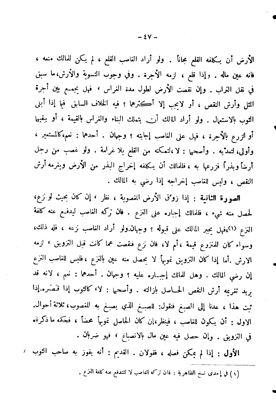 الصُّورَةُ الثَّانِيَةُ: إِذَا زَوَّقَ الْأَرْضَ الْمَغْصُوبَةَ، نُظِرَ إِنْ كَانَ بِحَيْثُ لَوْ نَزَعَ لَحَصَلَ مِنْهُ شَيْءٌ، فَلِلْمَالِكِ إِجْبَارُهُ عَلَى النَّزْعِ. فَإِنْ تَرَكَهُ الْغَاصِبُ لِيَدْفَعَ عَنْهُ كُلْفَةَ النَّزْعِ، فَهَلْ يُجْبَرُ الْمَالِكُ عَلَى قَبُولِهِ؟ وَجْهَانِ. وَلَوْ أَرَادَ الْغَاصِبُ نَزْعَهُ، فَلَهُ ذَلِكَ، وَسَوَاءٌ كَانَ لِلْمَنْزُوعِ قِيمَةٌ أَمْ لَا، فَإِنْ نَزَعَ فَنَقَصَتْ عَمَّا كَانَتْ قَبْلَ التَّزْوِيقِ، لَزِمَهُ الْأَرْشُ. أَمَّا إِذَا كَانَ التَّزْوِيقُ تَمْوِيهًا لَا يَحْصُلُ مِنْهُ عَيْنٌ بِالنَّزْعِ، فَلَيْسَ لِلْغَاصِبِ النَّزْعُ إِنْ رَضِيَ الْمَالِكُ. وَهَلْ لِلْمَالِكِ إِجْبَارُهُ عَلَيْهِ؟ وَجْهَانِ. أَحَدُهُمَا: نَعَمْ، لِأَنَّهُ قَدْ يُرِيدُ تَغْرِيمَهُ أَرْشَ النَّقْصِ الْحَاصِلِ بِإِزَالَتِهِ. وَأَصَحُّهُمَا: لَا، كَالثَّوْبِ إِذَا قَصَّرَهُ. إِذَا ثَبَتَ هَذَا، عُدْنَا إِلَى الصَّبْغِ فَنَقُولُ: لِلصَّبْغِ الَّذِي يُصْبَغُ بِهِ الْمَغْصُوبُ ثَلَاثَةُ أَحْوَالٍ. الْأَوَّلُ: أَنْ يَكُونَ لِلْغَاصِبِ، فَيُنْظَرُ، إِنْ كَانَ الْحَاصِلُ تَمْوِيهًا مَحْضًا فَحُكْمُهُ مَا ذَكَرْنَاهُ فِي التَّزْوِيقِ. وَإِنْ حَصَلَ فِيهِ عَيْنُ مَالٍ بِالِانْصِبَاغِ فَهُوَ ضَرْبَانِ.