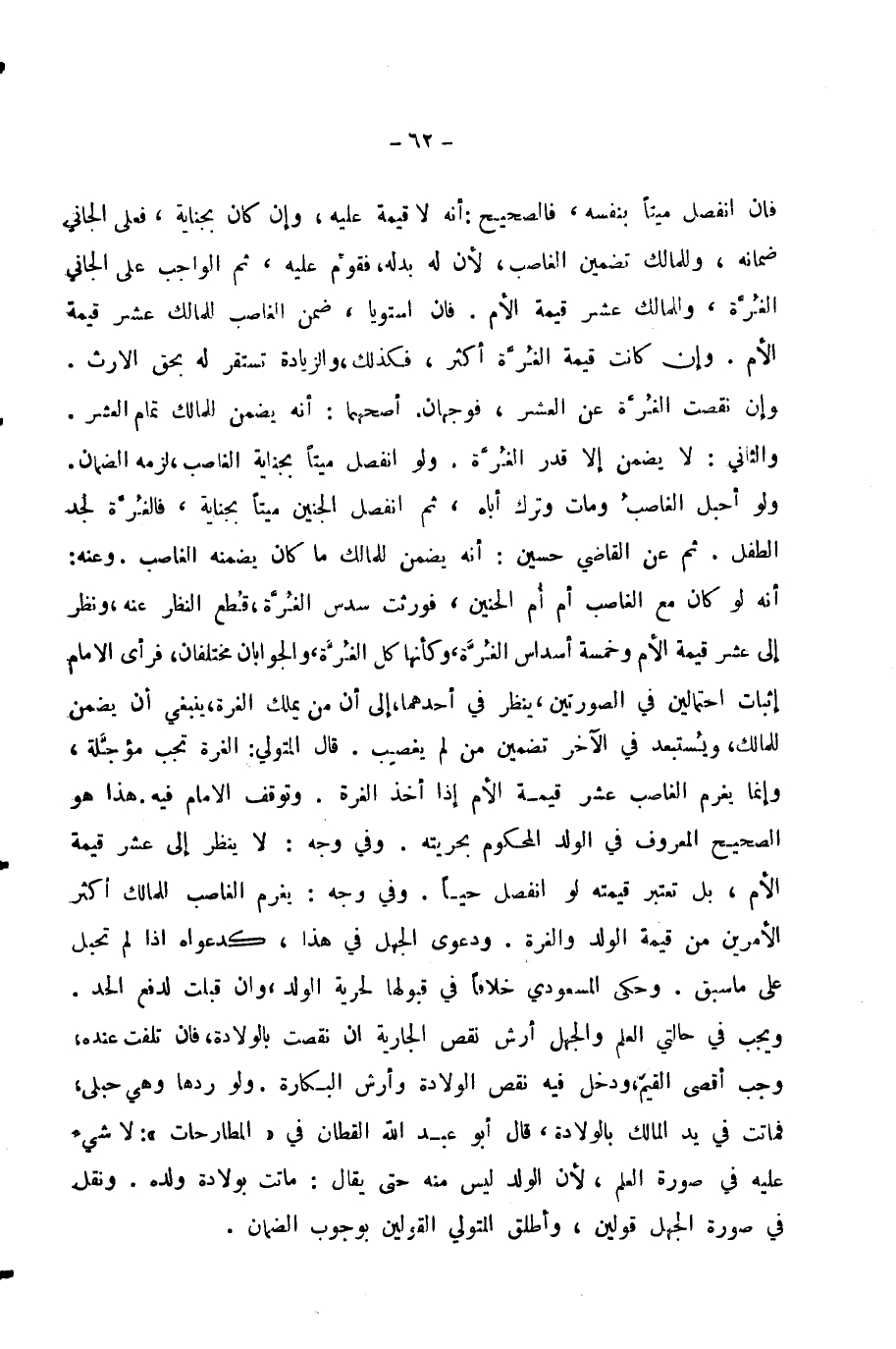 ثُمَّ عَنِ الْقَاضِي حُسَيْنٍ: أَنَّهُ يَضْمَنُ لِلْمَالِكِ مَا كَانَ يَضْمَنُهُ الْغَاصِبُ. وَعَنْهُ: أَنَّهُ لَوْ كَانَ مَعَ الْغَاصِبِ أُمُّ أُمِّ الْجَنِينِ، فَوَرِثَتْ سُدُسَ الْغُرَّةِ، قُطِعَ النَّظَرُ عَنْهُ، وَنُظِرَ إِلَى عُشْرِ قِيمَةِ الْأُمِّ وَخَمْسَةِ أَسْدَاسِ الْغُرَّةِ، وَكَأَنَّهَا كُلُّ الْغُرَّةِ، وَالْجَوَابَانِ مُخْتَلِفَانِ، فَرَأَى الْإِمَامُ إِثْبَاتَ احْتِمَالَيْنِ فِي الصُّورَتَيْنِ يُنْظَرُ فِي أَحَدِهِمَا، إِلَى أَنَّ مَنْ يَمْلِكُ الْغُرَّةَ، يَنْبَغِي أَنْ يَضْمَنَ لِلْمَالِكِ. وَيُسْتَبْعَدُ فِي الْآخَرِ تَضْمِينُ مَنْ لَمْ يَغْصِبْ. قَالَ الْمُتَوَلِّي: الْغُرَّةُ تَجِبُ مُؤَجَّلَةً، وَإِنَّمَا يَغْرَمُ الْغَاصِبُ عُشْرَ قِيمَةِ الْأُمِّ إِذَا أَخَذَ الْغُرَّةَ. وَتَوَقَّفَ الْإِمَامُ فِيهِ. هَذَا هُوَ الصَّحِيحُ الْمَعْرُوفُ فِي الْوَلَدِ الْمَحْكُومِ بِحُرِّيَّتِهِ.