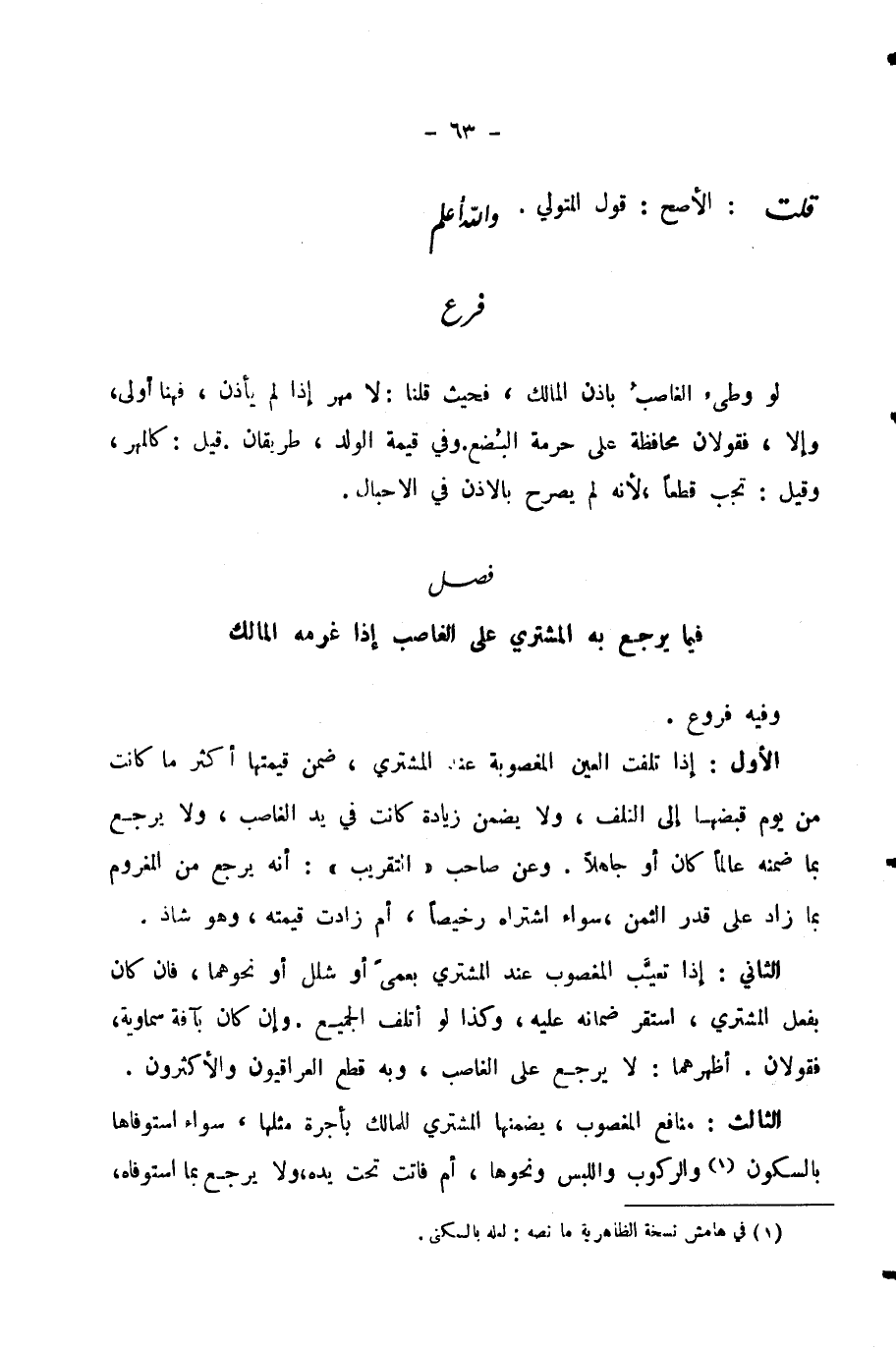 الْأَوَّلُ: إِذَا تَلِفَتِ الْعَيْنُ الْمَغْصُوبَةُ عِنْدَ الْمُشْتَرِي، ضَمِنَ قِيمَتَهَا أَكْثَرَ مَا كَانَتْ مِنْ يَوْمِ قَبْضِهَا إِلَى التَّلَفِ، وَلَا يَضْمَنُ زِيَادَةً كَانَتْ فِي يَدِ الْغَاصِبِ، وَلَا يَرْجِعُ بِمَا ضَمِنَهُ عَالِمًا كَانَ أَوْ جَاهِلًا. وَعَنْ صَاحِبِ «التَّقْرِيبِ» : أَنَّهُ يَرْجِعُ مِنَ الْمَغْرُومِ بِمَا زَادَ عَلَى قَدْرِ الثَّمَنِ، سَوَاءٌ اشْتَرَاهُ رَخِيصًا أَمْ زَادَتْ قِيمَتُهُ، وَهُوَ شَاذٌّ.