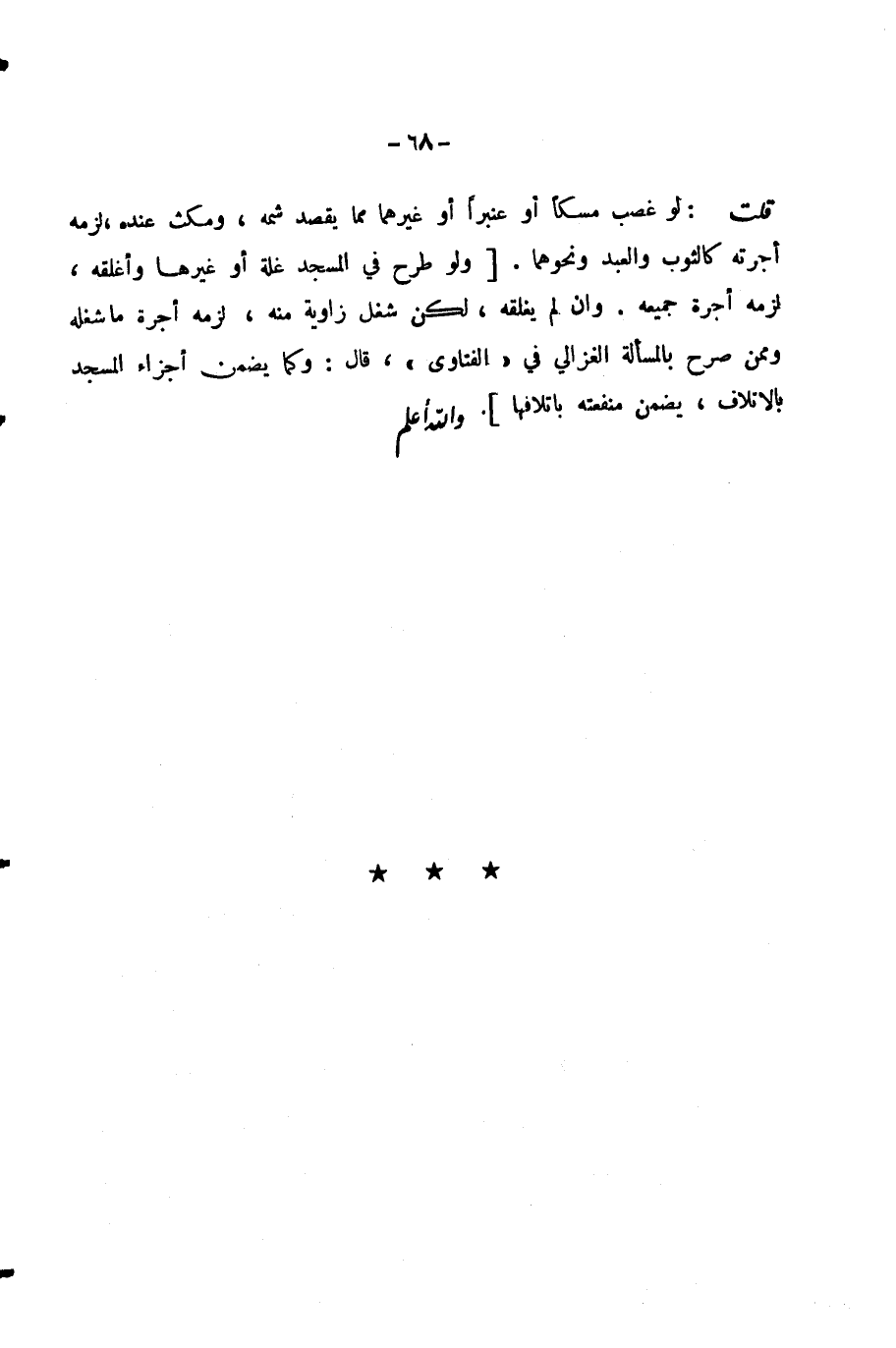 [وَلَوْ طَرَحَ فِي الْمَسْجِدِ غَلَّةً أَوْ غَيْرَهَا وَأَغْلَقَهُ لَزِمَهُ أُجْرَةُ جَمِيعِهِ. وَإِنْ لَمْ يُغْلِقْهُ، لَكِنْ شَغَلَ زَاوِيَةً مِنْهُ، لَزِمَهُ أُجْرَةُ مَا شَغَلَهُ وَمِمَّنْ صَرَّحَ بِالْمَسْأَلَةِ الْغَزَالِيُّ فِي الْفَتَاوَى، قَالَ: وَكَمَا يَضْمَنُ أَجْزَاءَ الْمَسْجِدِ بِالْإِتْلَافِ، يَضْمَنُ مَنْفَعَتَهُ بِإِتْلَافِهَا. وَاللَّهُ أَعْلَمُ.