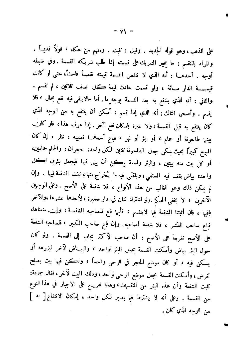 عَلَى الْمَذْهَبِ، وَهُوَ قَوْلُهُ الْجَدِيدُ. وَقِيلَ: تَثْبُتُ. وَمِنْهُمْ مَنْ حَكَاهُ، قَوْلًا قَدِيمًا. وَالْمُرَادُ بِالْمُنْقَسِمِ: مَا يُجْبَرُ الشَّرِيكُ عَلَى قِسْمَتِهِ إِذَا طَلَبَ شَرِيكُهُ الْقِسْمَةَ. وَفِي ضَبْطِهِ أَوْجُهٌ. أَحَدُهَا: أَنَّهُ الَّذِي لَا تُنْقِصُ الْقِسْمَةُ قِيمَتَهُ نَقْصًا فَاحِشًا، حَتَّى لَوْ كَانَتْ قِيمَةُ الدَّارِ مِائَةً، وَلَوْ قُسِمَتْ عَادَتْ قِيمَةُ كُلِّ نِصْفٍ ثَلَاثِينَ، لَمْ تُقْسَمْ. وَالثَّانِي: أَنَّهُ الَّذِي يُنْتَفَعُ بِهِ بَعْدَ الْقِسْمَةِ بِوَجْهٍ مَا. أَمَّا مَا لَا يَبْقَى فِيهِ نَفْعٌ بِحَالٍ، فَلَا يُقْسَمُ. وَأَصَحُّهُمَا الثَّالِثُ: أَنَّهُ الَّذِي إِذَا قُسِمَ أَمْكَنَ أَنْ يُنْتَفَعَ بِهِ مِنَ الْوَجْهِ الَّذِي كَانَ يُنْتَفَعُ بِهِ قَبْلَ الْقِسْمَةِ، وَلَا عِبْرَةَ بِإِمْكَانِ نَفْعٍ آخَرَ. إِذَا عُرِفَ هَذَا، فَلَوْ كَانَ بَيْنَهُمَا طَاحُونَةٌ أَوْ حَمَّامٌ، أَوْ بِئْرٌ أَوْ نَهَرٌ، فَبَاعَ أَحَدُهُمَا نَصِيبَهُ، نُظِرَ، إِنْ كَانَ الْمَبِيعُ كَبِيرًا بِحَيْثُ يُمْكِنُ جَعْلُ الطَّاحُونَةِ ثِنْتَيْنِ لِكُلِّ وَاحِدَةٍ حَجَرَانِ، وَالْحَمَّامِ حَمَّامَيْنِ، أَوْ كُلِّ بَيْتٍ مِنْهُ بَيْتَيْنِ، وَالْبِئْرُ وَاسِعَةٌ يُمْكِنُ أَنْ يُبْنَى فِيهَا فَيُجْعَلَ بِئْرَيْنِ لِكُلِّ وَاحِدَةٍ بَيَاضٌ يَقِفُ فِيهِ الْمُسْتَقِي وَيُلْقِي فِيهِ مَا يُخْرِجُ مِنْهَا، ثَبَتَتِ الشُّفْعَةُ فِيهَا. وَإِنْ لَمْ يُمْكِنْ ذَلِكَ وَهُوَ الْغَالِبُ مِنْ هَذِهِ الْأَنْوَاعِ، فَلَا شُفْعَةَ عَلَى الْأَصَحِّ.
