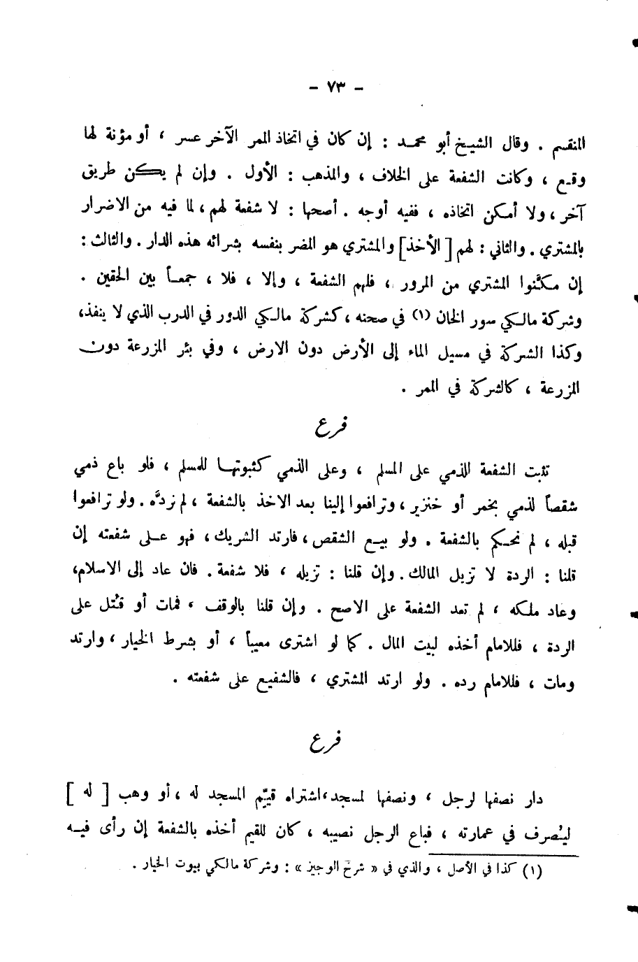 الْمُنْقَسِمِ. وَقَالَ الشَّيْخُ أَبُو مُحَمَّدٍ: إِنْ كَانَ فِي اتِّخَاذِ الْمَمَرِّ الْآخَرِ عُسْرٌ، أَوْ مُؤْنَةٌ لَهَا وَقْعٌ، وَكَانَتِ الشُّفْعَةُ عَلَى الْخِلَافِ، وَالْمَذْهَبُ: الْأَوَّلُ. وَإِنْ لَمْ يَكُنْ طَرِيقٌ آخَرُ، وَلَا أَمْكَنَ اتِّخَاذُهُ، فَفِيهِ أَوْجُهٌ. أَصَحُّهَا: لَا شُفْعَةَ لَهُمْ، لِمَا فِيهِ مِنَ الْإِضْرَارِ بِالْمُشْتَرِي. وَالثَّانِي: لَهُمْ [الْأَخْذُ] وَالْمُشْتَرِي هُوَ الْمُضِرُّ بِنَفْسِهِ بِشِرَائِهِ هَذِهِ الدَّارَ. وَالثَّالِثُ: إِنْ مَكَّنُوا الْمُشْتَرِيَ مِنَ الْمُرُورِ فَلَهُمُ الشُّفْعَةُ، وَإِلَّا فَلَا، جَمْعًا بَيْنَ الْحَقَّيْنِ. وَشَرِكَةُ مَالِكِي سُورِ الْخَانِ فِي صَحْنِهِ، كَشَرِكَةِ مَالِكِي الدُّورِ فِي الدَّرْبِ الَّذِي لَا يَنْفُذُ، وَكَذَا الشَّرِكَةُ فِي مَسِيلِ الْمَاءِ إِلَى الْأَرْضِ دُونَ الْأَرْضِ، وَفِي بِئْرِ الْمَزْرَعَةِ دُونَ الْمَزْرَعَةِ، كَالشَّرِكَةِ فِي الْمَمَرِّ.