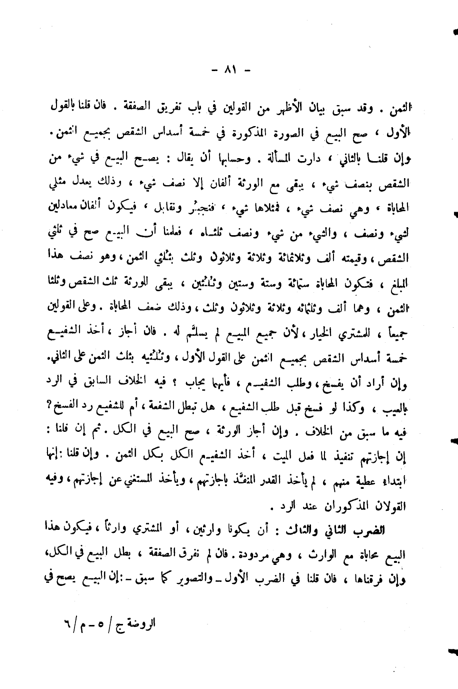 الثَّمَنِ. وَقَدْ سَبَقَ بَيَانُ الْأَظْهَرِ مِنَ الْقَوْلَيْنِ فِي بَابِ تَفْرِيقِ الصَّفْقَةِ. فَإِنْ قُلْنَا بِالْقَوْلِ الْأَوَّلِ، صَحَّ الْبَيْعُ فِي الصُّورَةِ الْمَذْكُورَةِ فِي خَمْسَةِ أَسْدَاسِ الشِّقْصِ بِجَمِيعِ الثَّمَنِ. وَإِنْ قُلْنَا بِالثَّانِي، دَارَتِ الْمَسْأَلَةُ. وَحِسَابُهَا أَنْ يُقَالَ: يَصِحُّ الْبَيْعُ فِي شَيْءٍ مِنَ الشِّقْصِ بِنِصْفِ شَيْءٍ، يَبْقَى مَعَ الْوَرَثَةِ أَلْفَانِ إِلَّا نِصْفَ شَيْءٍ، وَذَلِكَ يَعْدِلُ مِثْلَيِ الْمُحَابَاةِ، وَهِيَ نِصْفُ شَيْءٍ، فَمِثْلَاهَا شَيْءٌ، فَنَجْبِرُ وَنُقَابِلُ، فَيَكُونُ أَلْفَانِ مُعَادِلَيْنِ لِشَيْءٍ وَنِصْفٍ، وَالشَّيْءُ مِنْ شَيْءٍ وَنِصْفٍ ثُلُثَاهُ، فَعَلِمْنَا أَنَّ الْبَيْعَ صَحَّ فِي ثُلُثَيِ الشِّقْصِ، وَقِيمَتُهُ أَلْفٌ وَثَلَاثُمِائَةٍ وَثَلَاثَةٌ وَثَلَاثُونَ وَثُلُثٌ بِثُلُثَيِ الثَّمَنِ، وَهُوَ نِصْفُ هَذَا الْمَبْلَغِ، فَتَكُونُ الْمُحَابَاةُ سِتَّمِائَةٍ وَسِتَّةً وَسِتِّينَ وَثُلُثَيْنِ، يَبْقَى لِلْوَرَثَةِ ثُلُثُ الشِّقْصِ وَثُلُثَا الثَّمَنِ، وَهُمَا أَلْفٌ وَثَلَاثُمِائَةٍ وَثَلَاثُونَ وَثُلُثٌ، وَذَلِكَ ضِعْفٌ وَثَلَاثَةُ الْمُحَابَاةِ. وَعَلَى الْقَوْلَيْنِ جَمِيعًا، لِلْمُشْتَرِي الْخِيَارُ، لِأَنَّ جَمِيعَ الْمَبِيعِ لَمْ يُسَلَّمْ لَهُ. فَإِنْ أَجَازَ أَخَذَ الشَّفِيعُ خَمْسَةَ أَسْدَاسِ الشِّقْصِ بِجَمِيعِ الثَّمَنِ عَلَى الْقَوْلِ الْأَوَّلِ وَثُلُثَيْهِ بِثُلُثِ الثَّمَنِ عَلَى الثَّانِي. وَإِنْ أَرَادَ أَنْ يَفْسَخَ، وَطَلَبَ الشَّفِيعُ، فَأَيُّهُمَا يُجَابُ؟ فِيهِ الْخِلَافُ السَّابِقُ فِي الرَّدِّ بِالْعَيْبِ، وَكَذَا لَوْ فَسَخَ قَبْلَ طَلَبِ الشَّفِيعِ، هَلْ تَبْطُلُ الشُّفْعَةُ، أَمْ لِلشَّفِيعِ رَدُّ الْفَسْخِ؟ فِيهِ مَا سَبَقَ مِنَ الْخِلَافِ. وَإِنْ أَجَازَ الْوَرَثَةُ، صَحَّ الْبَيْعُ فِي الْكُلِّ. ثُمَّ إِنْ قُلْنَا: إِنَّ إِجَازَتَهُمْ تَنْفِيذٌ لِمَا فَعَلَ الْمَيِّتُ أَخَذَ الشَّفِيعُ الْكُلَّ بِكُلِّ الثَّمَنِ. وَإِنْ قُلْنَا: إِنَّهَا ابْتِدَاءُ عَطِيَّةٍ مِنْهُمْ، لَمْ يَأْخُذِ الْقَدْرَ الْمُنْفَذَ بِإِجَازَتِهِمْ، وَيَأْخُذُ الْمُسْتَغْنِيَ عَنْ إِجَازَتِهِمْ، وَفِيهِ الْقَوْلَانِ الْمَذْكُورَانِ عِنْدَ الرَّدِّ.