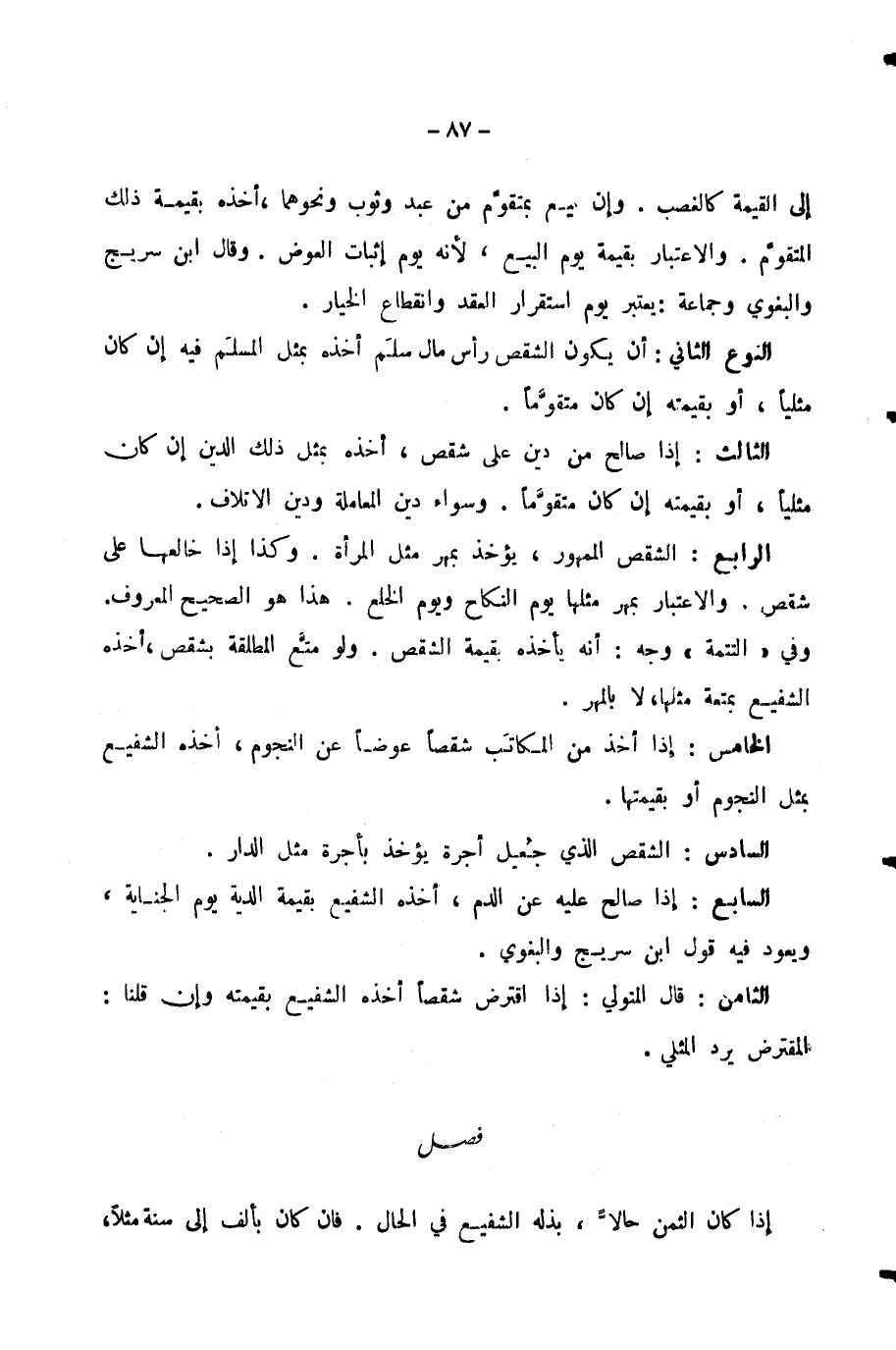 الثَّامِنُ: قَالَ الْمُتَوَلِّي: إِذَا اقْتَرَضَ شِقْصًا أَخَذَهُ الشَّفِيعُ بِقِيمَتِهِ وَإِنْ قُلْنَا: الْمُقْتَرِضُ يَرُدُّ الْمِثْلِيَّ.