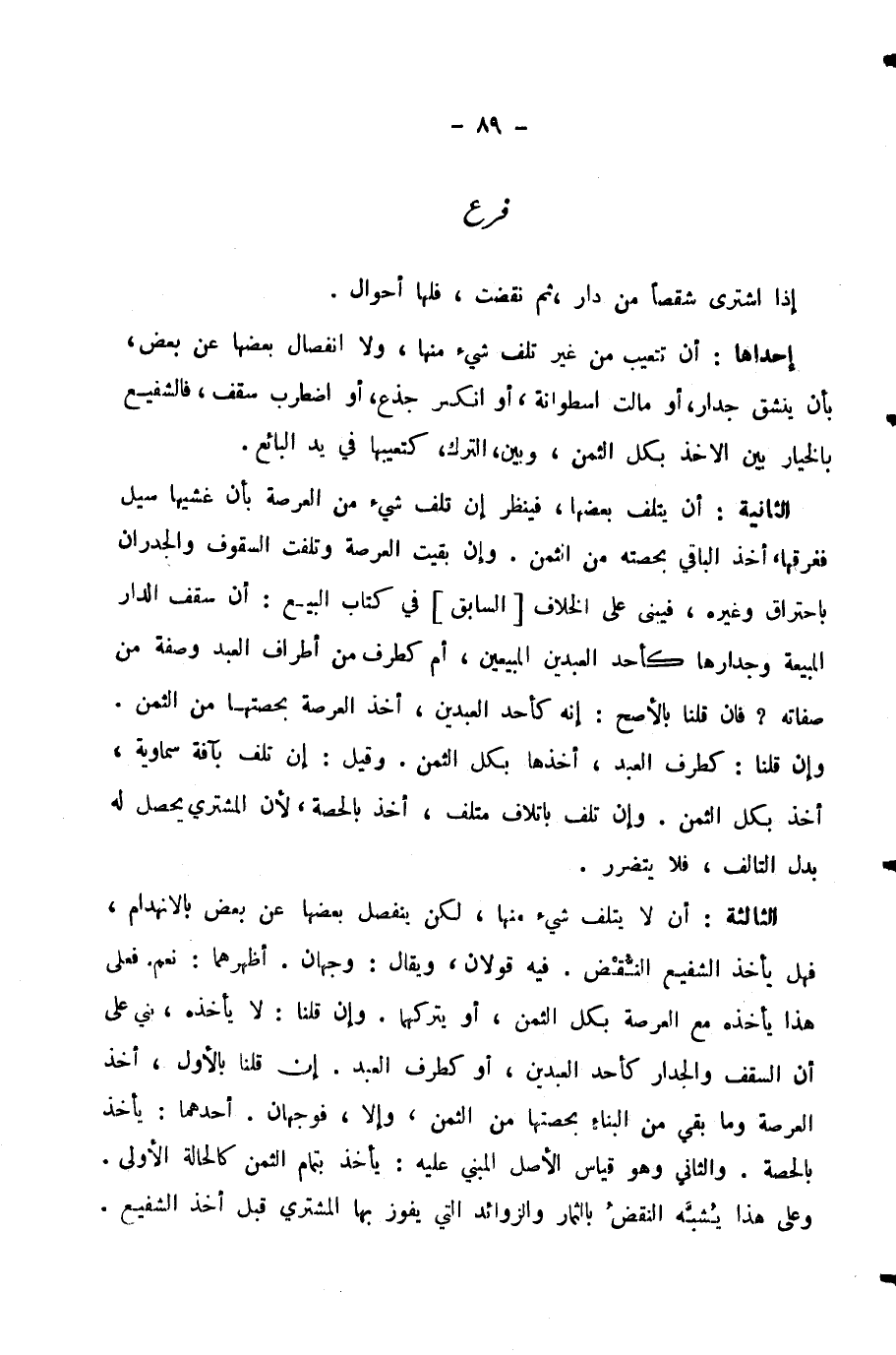 الثَّانِيَةُ: أَنْ يَتْلَفَ بَعْضُهَا، فَيُنْظَرُ إِنْ تَلِفَ شَيْءٌ مِنَ الْعَرْصَةِ بِأَنْ غَشِيَهَا سَيْلٌ فَغَرَّقَهَا، أَخَذَ الْبَاقِيَ بِحِصَّتِهِ مِنَ الثَّمَنِ. وَإِنْ بَقِيَتِ الْعَرْصَةُ وَتَلِفَتِ السُّقُوفُ وَالْجُدْرَانُ بِاحْتِرَاقٍ وَغَيْرِهِ، فَيُبْنَى عَلَى الْخِلَافِ [السَّابِقِ] فِي كِتَابِ الْبَيْعِ: أَنَّ سَقْفَ الدَّارِ الْمَبِيعَةِ وَجِدَارَهَا كَأَحَدِ الْعَبْدَيْنِ الْمَبِيعَيْنِ، أَمْ كَطَرَفٍ مِنْ أَطْرَافِ الْعَبْدِ وَصِفَةٍ مِنْ صِفَاتِهِ؟ فَإِنْ قُلْنَا بِالْأَصَحِّ: إِنَّهُ كَأَحَدِ الْعَبْدَيْنِ، أَخَذَ الْعَرْصَةَ بِحِصَّتِهَا مِنَ الثَّمَنِ. وَإِنْ قُلْنَا: كَطَرَفِ الْعَبْدِ، أَخَذَهَا بِكُلِّ الثَّمَنِ. وَقِيلَ: إِنْ تَلِفَ بِآفَةٍ سَمَاوِيَّةٍ أَخَذَ بِكُلِّ الثَّمَنِ. وَإِنْ تَلِفَ بِإِتْلَافِ مُتْلِفٍ أَخَذَ بِالْحِصَّةِ، لِأَنَّ الْمُشْتَرِيَ يَحْصُلُ لَهُ بَدَلُ التَّالِفِ، فَلَا يَتَضَرَّرُ.