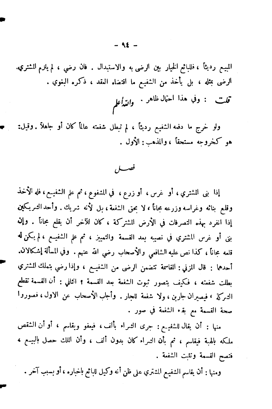 إِذَا بَنَى الْمُشْتَرِي، أَوْ غَرَسَ، أَوْ زَرَعَ، فِي الْمَشْفُوعِ، ثُمَّ عَلِمَ الشَّفِيعُ، فَلَهُ الْأَخْذُ وَقَلْعُ بِنَائِهِ وَغِرَاسِهِ وَزَرْعِهِ مَجَّانًا، لَا بِحَقِّ الشُّفْعَةِ، بَلْ لِأَنَّهُ شَرِيكٌ. وَأَحَدُ الشَّرِيكَيْنِ إِذَا انْفَرَدَ بِهَذِهِ التَّصَرُّفَاتِ فِي الْأَرْضِ الْمُشْتَرَكَةِ، كَانَ لِلْآخَرِ أَنْ يَقْلَعَ مَجَّانًا. وَإِنْ بَنَى أَوْ غَرَسَ الْمُشْتَرِي فِي نَصِيبِهِ بَعْدَ الْقِسْمَةِ وَالتَّمْيِيزِ، ثُمَّ عَلِمَ الشَّفِيعُ، لَمْ يَكُنْ لَهُ قَلْعُهُ مَجَّانًا، كَذَا نَصَّ عَلَيْهِ الشَّافِعِيُّ وَالْأَصْحَابُ رَضِيَ اللَّهُ عَنْهُمْ. وَفِي الْمَسْأَلَةِ إِشْكَالَانِ. أَحَدُهُمَا: قَالَ الْمُزَنِيُّ: الْمُقَاسَمَةُ تَتَضَمَّنُ الرِّضَا مِنَ الشَّفِيعِ، وَإِذَا رَضِيَ بِتَمَلُّكِ الْمُشْتَرِي بَطَلَتْ شُفْعَتُهُ، فَكَيْفَ يُتَصَوَّرُ ثُبُوتُ الشُّفْعَةِ بَعْدَ الْقِسْمَةِ؟ الثَّانِي أَنَّ الْقِسْمَةَ تَقْطَعُ الشَّرِكَةَ، فَيَصِيرَانِ جَارَيْنِ، وَلَا شُفْعَةَ لِلْجَارِ. وَأَجَابَ الْأَصْحَابُ عَنِ الْأَوَّلِ، فَصَوَّرُوا صِحَّةَ الْقِسْمَةِ مَعَ بَقَاءِ الشُّفْعَةِ فِي صُوَرٍ.