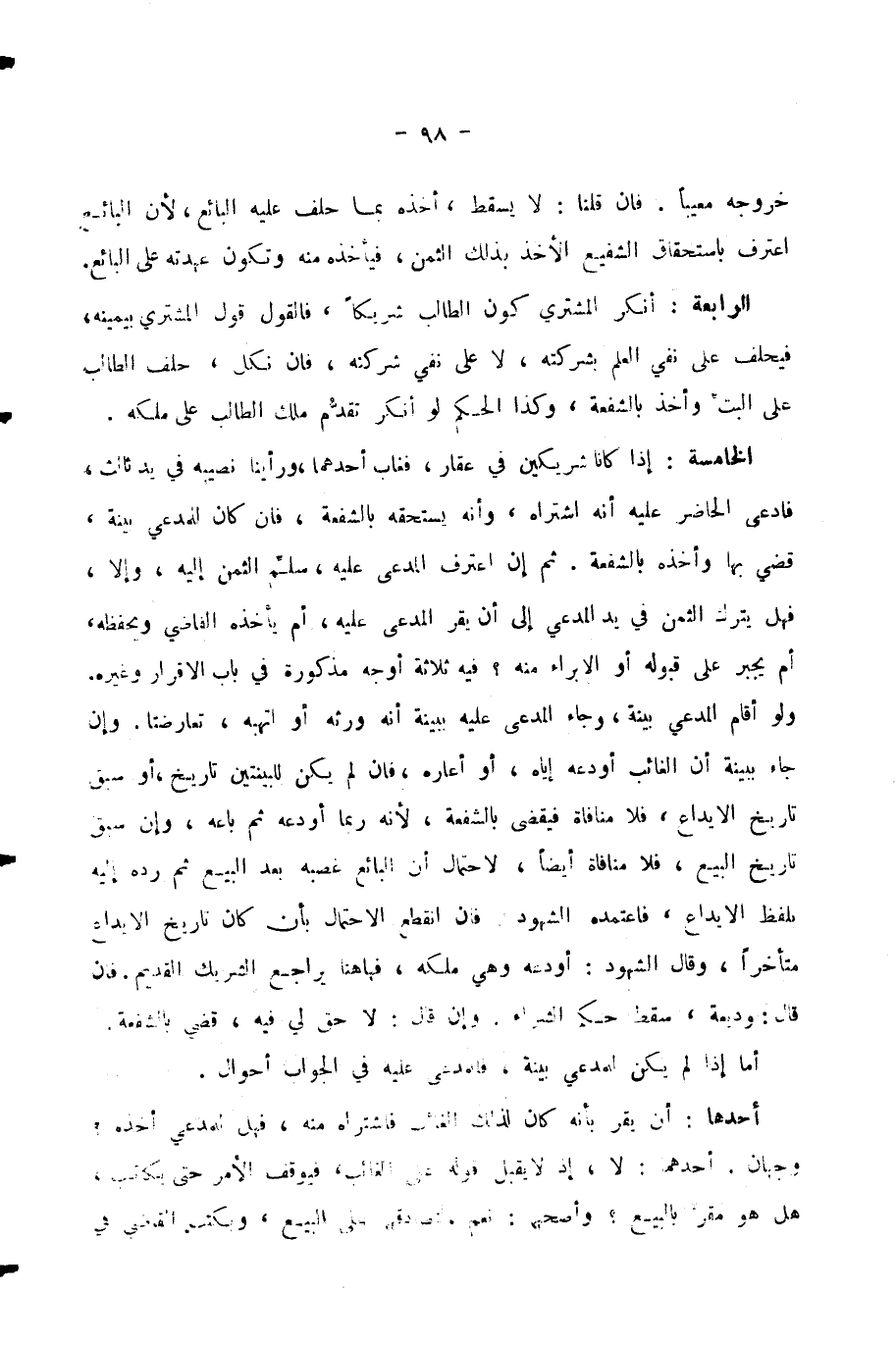 الْخَامِسَةُ: إِذَا كَانَا شَرِيكَيْنِ فِي عَقَارٍ، فَغَابَ أَحَدُهُمَا، وَرَأَيْنَا نَصِيبَهُ فِي يَدِ ثَالِثٍ، فَادَّعَى الْحَاضِرُ عَلَيْهِ أَنَّهُ اشْتَرَاهُ، وَأَنَّهُ يَسْتَحِقُّهُ بِالشُّفْعَةِ، فَإِنْ كَانَ لِلْمُدَّعِي بَيِّنَةٌ، قُضِيَ بِهَا وَأَخَذَهُ بِالشُّفْعَةِ. ثُمَّ إِنِ اعْتَرَفَ الْمُدَّعَى عَلَيْهِ، سُلِّمَ الثَّمَنُ إِلَيْهِ، وَإِلَّا فَهَلْ يُتْرَكُ الثَّمَنُ فِي يَدِ الْمُدَّعِي إِلَى أَنْ يُقِرَّ الْمُدَّعَى عَلَيْهِ، أَمْ يَأْخُذُهُ الْقَاضِي وَيَحْفَظُهُ، أَمْ يُجْبَرُ عَلَى قَبُولِهِ أَوِ الْإِبْرَاءِ مِنْهُ؟ فِيهِ ثَلَاثَةُ أَوْجُهٍ مَذْكُورَةٍ فِي بَابِ الْإِقْرَارِ وَغَيْرِهِ.