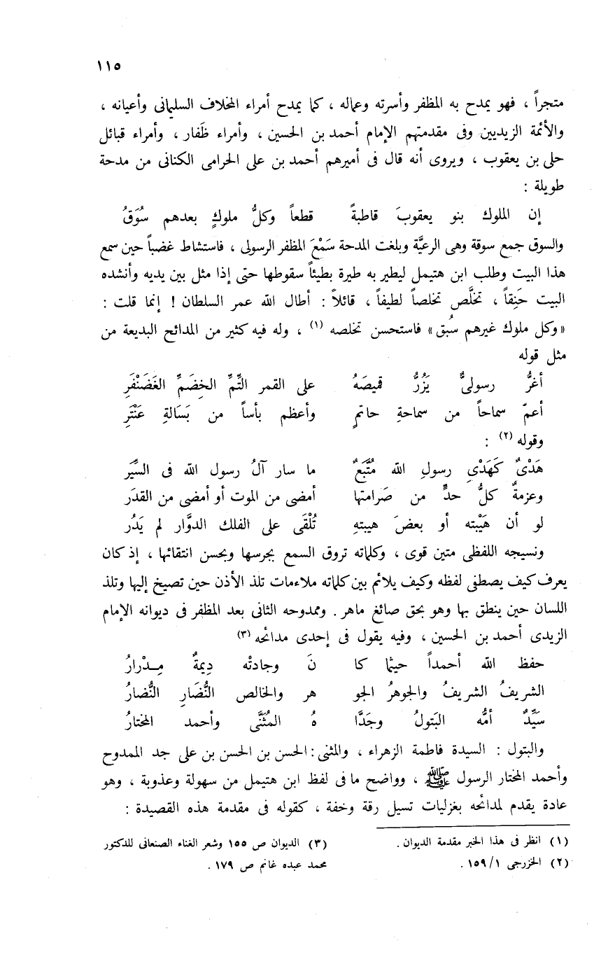 ونسيجه اللفظى متين قوى، وكلماته تروق السمع بجرسها وبحسن انتقائها، إذ كان يعرف كيف يصطفى لفظه وكيف يلائم بين كلماته ملاءمات تلذ الأذن حين تصيخ إليها وتلذ اللسان حين ينطق بها وهو بحق صائغ ماهر. وممدوحه الثانى بعد المظفر فى ديوانه الإمام الزيدى أحمد بن الحسين، وفيه يقول فى إحدى مدائحه (¬3)