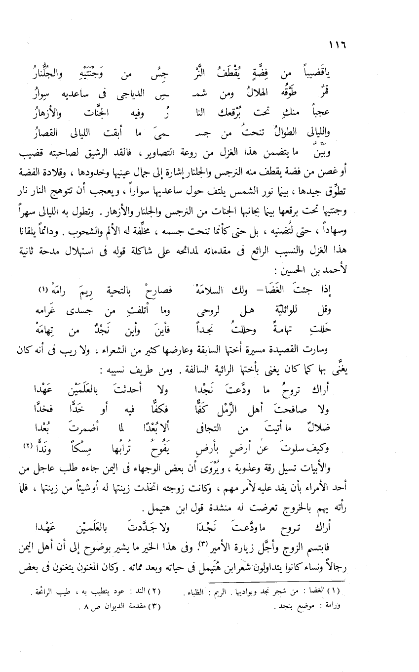 وبيّن ما يتضمن هذا الغزل من روعة التصاوير، فالقد الرشيق لصاحبته قضيب أو غصن من فضة يقطف منه النرجس والجلنار إشارة إلى جمال عينيها وخدودها، وقلادة الفضة تطوّق جيدها، بينما نور الشمس يلتف حول ساعديها سوارا، ويعجب أن تتوهج النار نار وجنتيها تحت برقعها بينما بجانبها الجنات من النرجس والجلنار والأزهار. وتطول به الليالى سهرا وسهادا، حتى لتضنيه، بل حتى كأنما تنحت جسمه، مخلّفة له الألم والشحوب. ودائما يلقانا هذا الغزل والنسيب الرائع فى مقدماته لمدائحه على شاكلة قوله فى استهلال مدحة ثانية لأحمد بن الحسين: