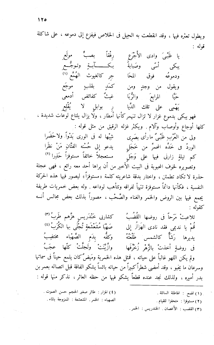 وتصويره لخوف المحبوبة فى البيت الأخير من أن يراها أحد معه رائع، فهى عجلة حذرة لا تكاد تطمئن، واختار بدقة شاعريته كلمة «مستوفزا» ليصور فيها هذه الحركة النفسية، فكأنها دائما مستوفزة تتهيأ لفراقه وتتأهب لوداعه. وله بعض خمريات طريفة يجمع فيها بين الروض والخمر والغناء والصّحب، مصورا بذلك بعض مجالس أنسه كقوله: