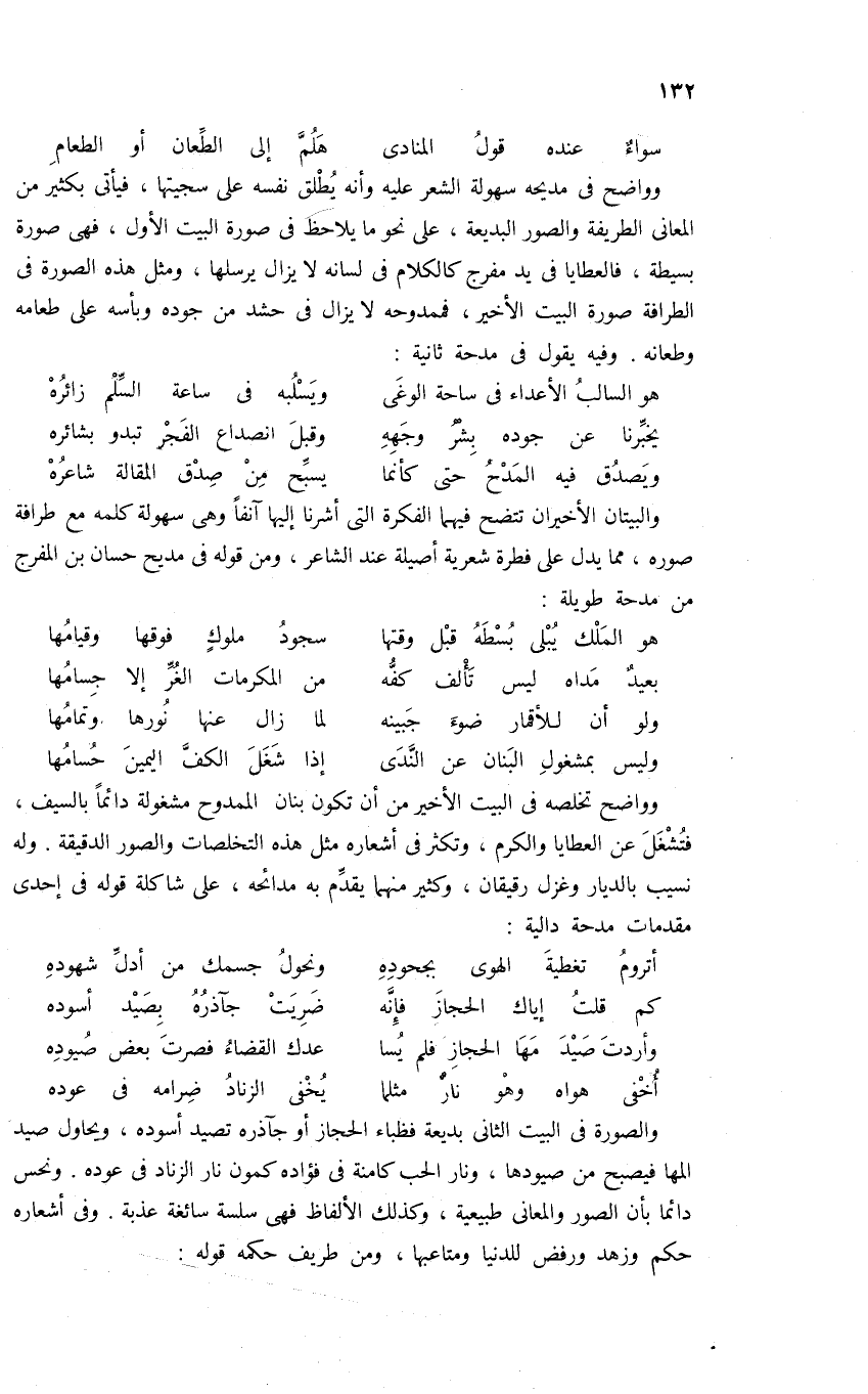 وواضح فى مديحه سهولة الشعر عليه وأنه يطلق نفسه على سجيتها، فيأتى بكثير من المعانى الطريفة والصور البديعة، على نحو ما يلاحظ فى صورة البيت الأول، فهى صورة بسيطة، فالعطايا فى يد مفرج كالكلام فى لسانه لا يزال يرسلها، ومثل هذه الصورة فى الطرافة صورة البيت الأخير، فممدوحه لا يزال فى حشد من جوده وبأسه على طعامه وطعانه. وفيه يقول فى مدحه ثانية: