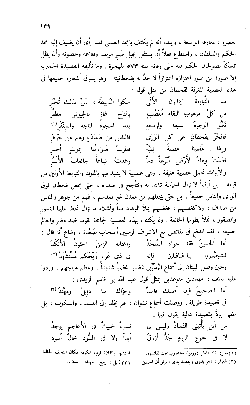 والأبيات تحمل عصبية عنيفة، وهى عصبية لا يشيد فيها بالملوك والتبابعة الأولين من قومه، بل أيضا لا تزال الحماسة تشتد به وتتأجج فى صدره، حتى يجعل قحطان فوق الورى والناس جميعا، بل حتى يجعلهم من معدن غير معدنهم، فهم من جوهر والناس من صدف، ولا كغضبهم، فغضبهم يملأ الوهاد دما وأشلاء ما تزال تحط عليها النسور والصقور، تملأ بطونها الجائعة. ولم يكتف بهذه العصبية الجامحة لقومه ضد مضر والعالم جميعه، فقد اندفع فى نقائض مع الأشراف الرسيين أصحاب صعدة، وشاع أنه قال: