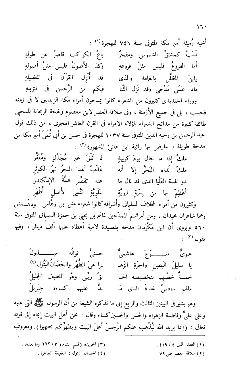 وهو يشير فى البيتين الثالث والرابع إلى ما تذكره الشيعة من أن الرسول صلى الله عليه وسلم ألقى عليه وعلى علىّ وفاطمة الزهراء والحسن والحسين كساء وقال: نحن أهل البيت إيماء إلى قوله تعالى: {إِنَّما يُرِيدُ اللهُ لِيُذْهِبَ عَنْكُمُ الرِّجْسَ أَهْلَ الْبَيْتِ وَيُطَهِّرَكُمْ تَطْهِيراً}. ومعروف