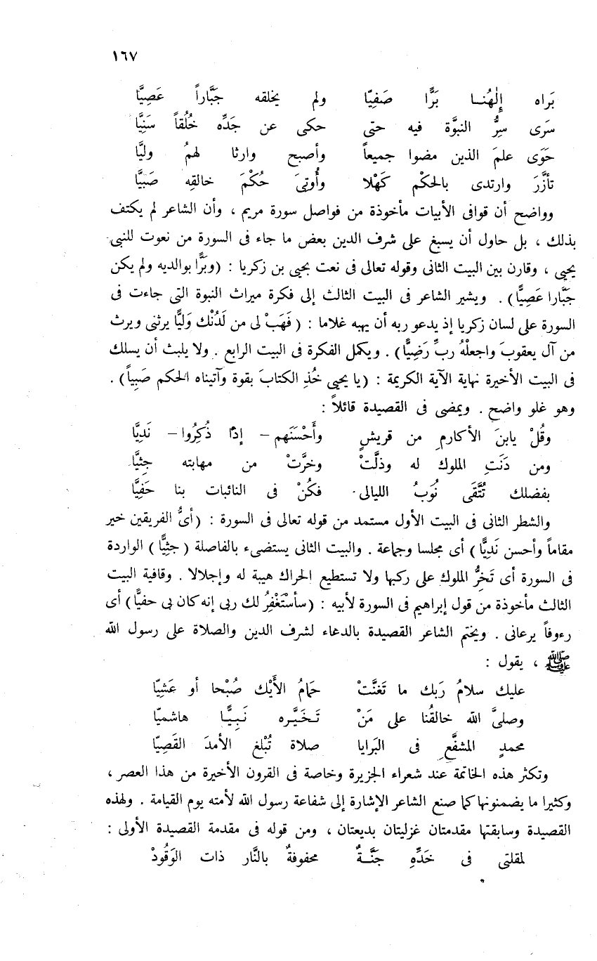 والشطر الثانى فى البيت الأول مستمد من قوله تعالى فى السورة: {(أَيُّ الْفَرِيقَيْنِ خَيْرٌ مَقاماً وَأَحْسَنُ نَدِيًّا)} أى مجلسا وجماعة. والبيت الثانى يستضئ بالفاصلة (جثيّا) الواردة فى السورة أى تخرّ الملوك على ركبها ولا تستطيع الحراك هيبة له وإجلالا. وقافية البيت الثالث مأخوذة من قول إبراهيم فى السورة لأبيه: {(سَأَسْتَغْفِرُ لَكَ رَبِّي إِنَّهُ كانَ بِي حَفِيًّا)} أى رءوفا يرعانى. ويختم الشاعر القصيدة بالدعاء لشرف الدين والصلاة على رسول الله صلى الله عليه وسلم، يقول: