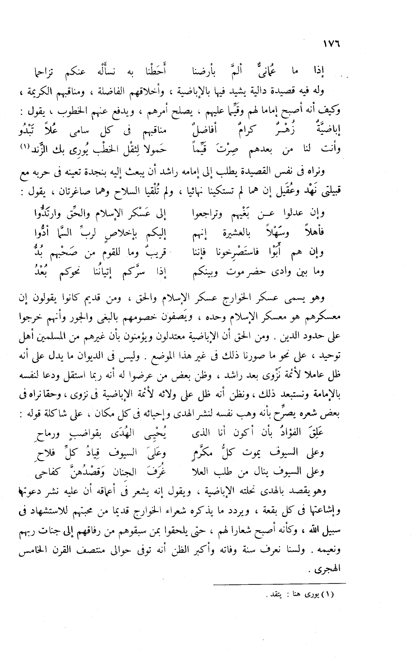 وهو يقصد بالهدى نحلته الإباضية، ويقول إنه يشعر فى أعماقه أن عليه نشر دعوتها وإشاعتها فى كل بقعة، ويردد ما يذكره شعراء الخوارج قديما من محبتهم للاستشهاد فى سبيل الله، وكأنه أصبح شعارا لهم، حتى يلحقوا بمن سبقوهم من رفاقهم إلى جنات ربهم ونعيمه. ولسنا نعرف سنة وفاته وأكبر الظن أنه توفى حوالى منتصف القرن الخامس الهجرى.