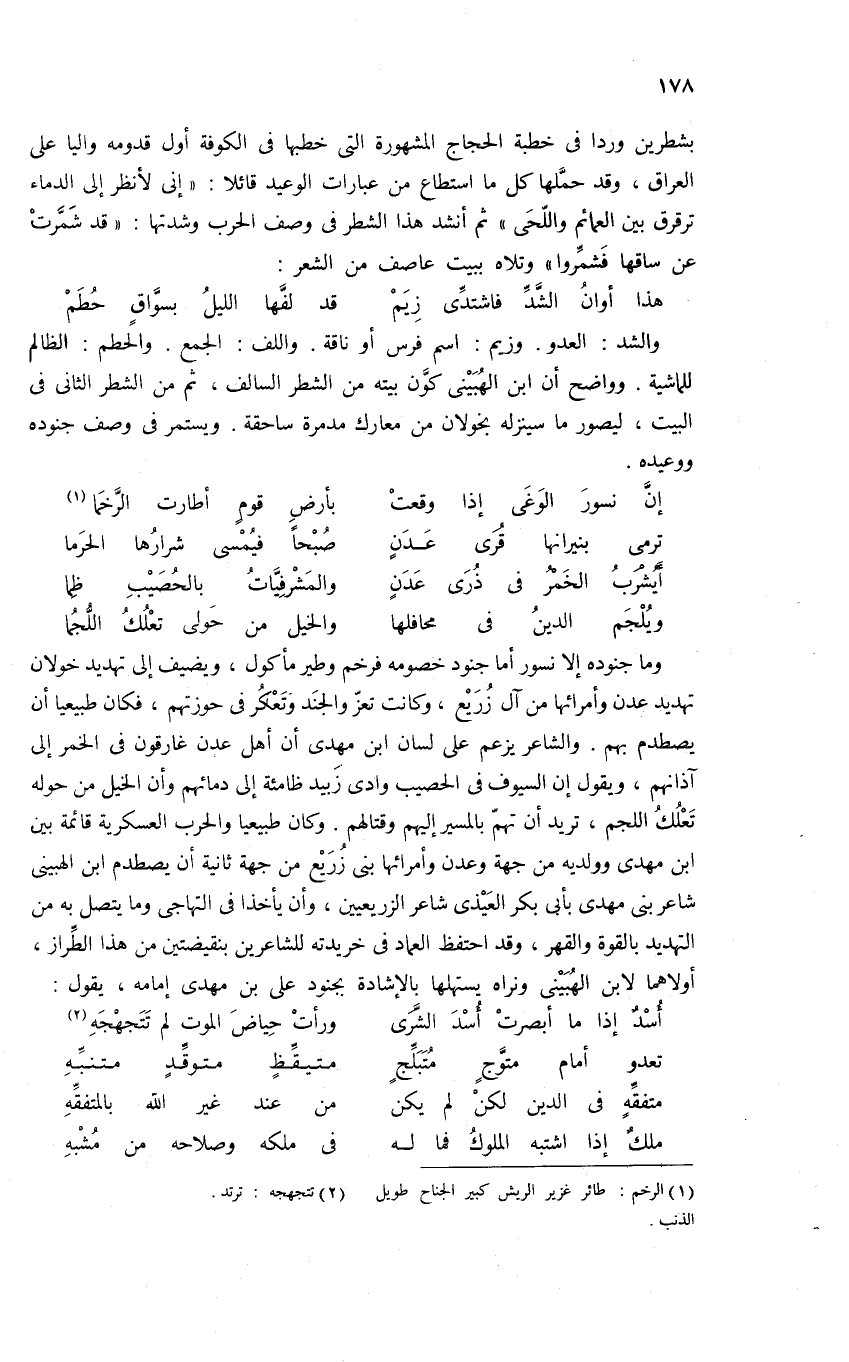 والشد: العدو. وزيم: اسم فرس أو ناقة. واللف: الجمع. والحطم: الظالم للماشية. وواضح أن ابن الهبينى كوّن بيته من الشطر السالف، ثم من الشطر الثانى فى البيت، ليصور ما سينزله بخولان من معارك مدمرة ساحقة. ويستمر فى وصف جنوده ووعيده.