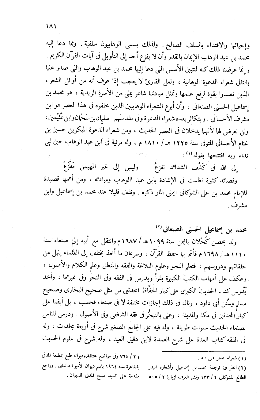 (¬2) انظر فى ترجمة محمد بن إسماعيل وأشعاره البدر الطالع للشوكانى 2/ 133 ونشر العرف لزبارة 2/ 505 و 2/ 764 وفى مواضع مختلفة. وديوانه طبع بمطبعة المدنى بالقاهرة سنة 1964 باسم ديوان الأمير الصنعانى. وراجع مقدمة على السيد صبح المدنى للديوان.