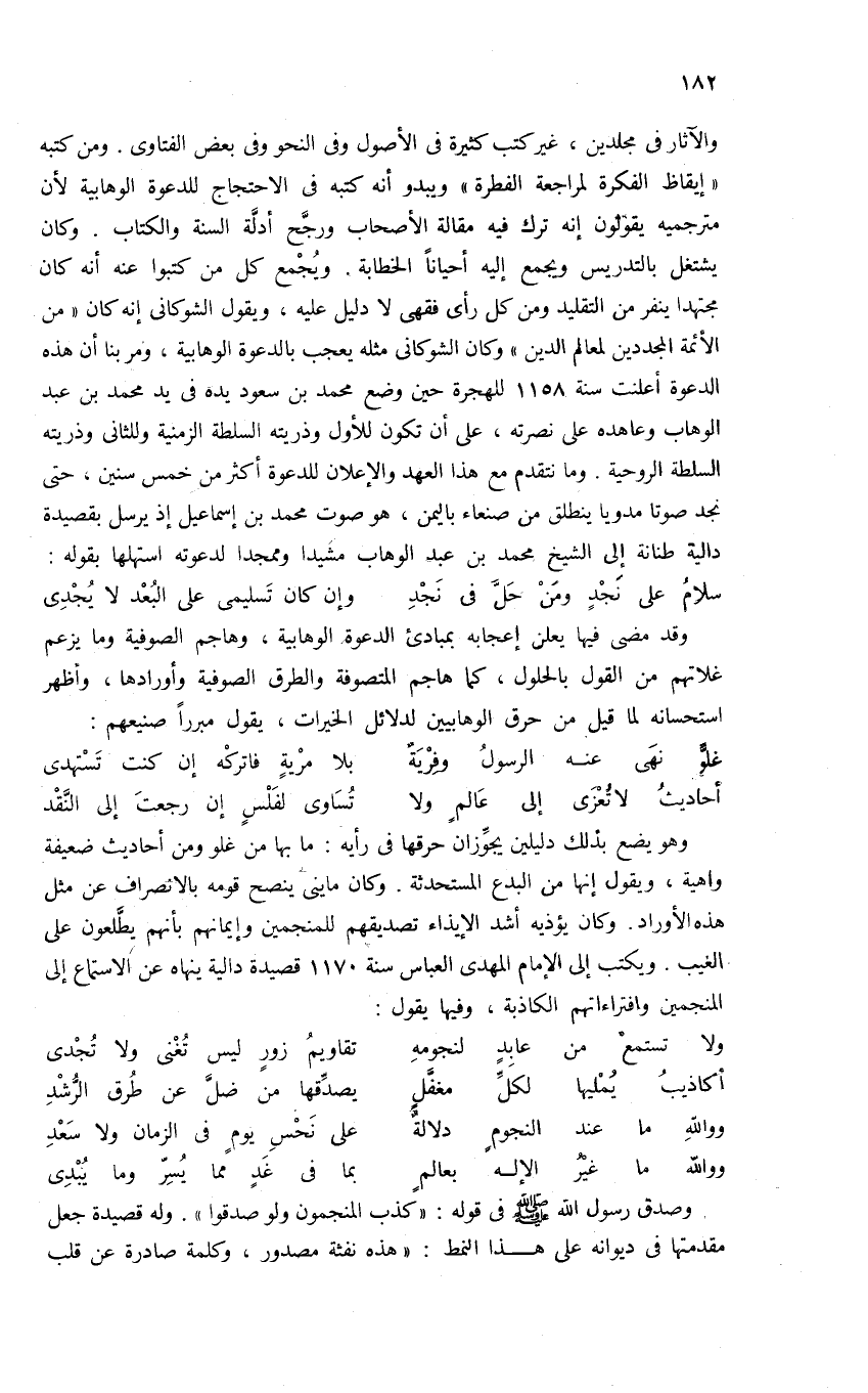 والآثار فى مجلدين، غير كتب كثيرة فى الأصول وفى النحو وفى بعض الفتاوى. ومن كتبه «إيقاظ الفكرة لمراجعة الفطرة» ويبدو أنه كتبه فى الاحتجاج للدعوة الوهابية لأن مترجميه يقولون إنه ترك فيه مقالة الأصحاب ورجّح أدلّة السنة والكتاب. وكان يشتغل بالتدريس ويجمع إليه أحيانا الخطابة. ويجمع كل من كتبوا عنه أنه كان مجتهدا ينفر من التقليد ومن كل رأى فقهى لا دليل عليه، ويقول الشوكانى إنه كان «من الأئمة المجددين لمعالم الدين» وكان الشوكانى مثله يعجب بالدعوة الوهابية، ومر بنا أن هذه الدعوة أعلنت سنة 1158 للهجرة حين وضع محمد بن سعود يده فى يد محمد بن عبد الوهاب وعاهده على نصرته، على أن تكون للأول وذريته السلطة الزمنية وللثانى وذريته السلطة الروحية. وما نتقدم مع هذا العهد والإعلان للدعوة أكثر من خمس سنين، حتى نجد صوتا مدويا ينطلق من صنعاء باليمن، هو صوت محمد بن إسماعيل إذ يرسل بقصيدة دالية طنانة إلى الشيخ محمد بن عبد الوهاب مشيدا وممجدا لدعوته استهلها بقوله: