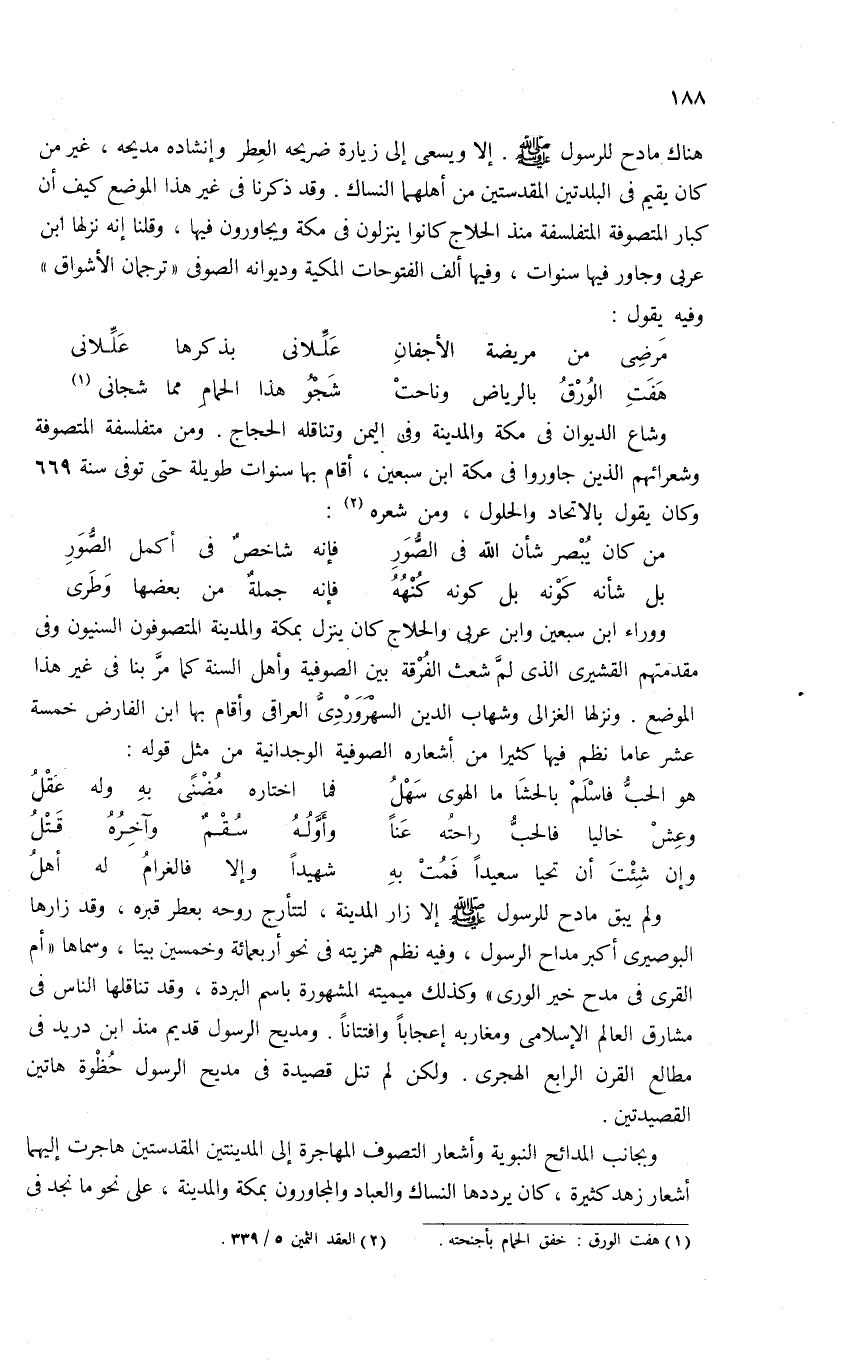 هناك مادح للرسول صلى الله عليه وسلم. إلا ويسعى إلى زيارة ضريحه العطر وإنشاده مديحه، غير من كان يقيم فى البلدتين المقدستين من أهلهما النساك. وقد ذكرنا فى غير هذا الموضع كيف أن كبار المتصوفة المتفلسفة منذ الحلاج كانوا ينزلون فى مكة ويجاورون فيها، وقلنا إنه نزلها ابن عربى وجاور فيها سنوات، وفيها ألف الفتوحات المكية وديوانه الصوفى «ترجمان الأشواق» وفيه يقول: