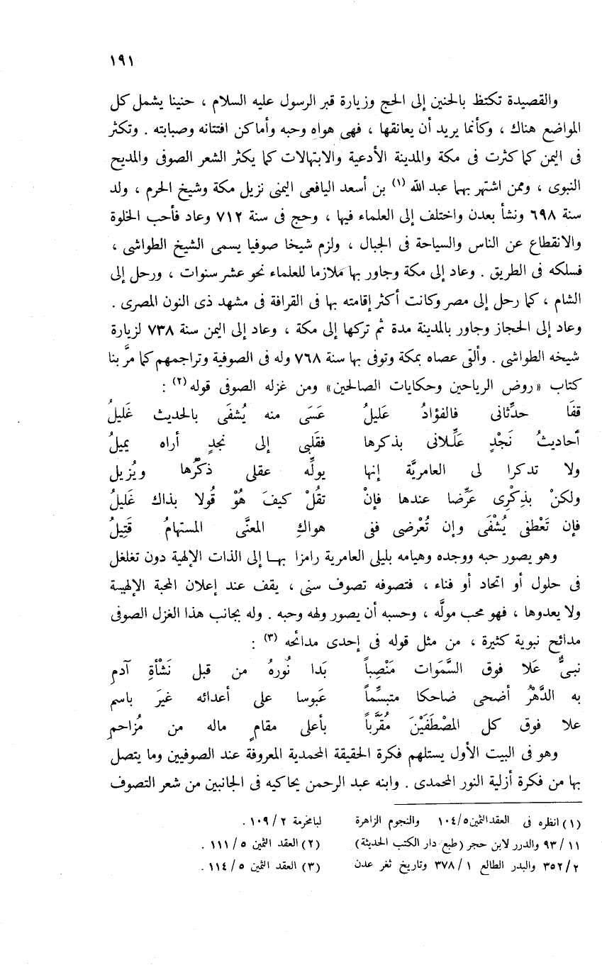 والقصيدة تكتظ بالحنين إلى الحج وزيارة قبر الرسول عليه السلام، حنينا يشمل كل المواضع هناك، وكأنما يريد أن يعانقها، فهى هواه وحبه وأماكن افتتانه وصبابته. وتكثر فى اليمن كما كثرت فى مكة والمدينة الأدعية والابتهالات كما يكثر الشعر الصوفى والمديح النبوى، وممن اشتهر بهما عبد الله (¬1) بن أسعد اليافعى اليمنى نزيل مكة وشيخ الحرم، ولد سنة 698 ونشأ بعدن واختلف إلى العلماء فيها، وحج فى سنة 712 وعاد فأحب الخلوة والانقطاع عن الناس والسياحة فى الجبال، ولزم شيخا صوفيا يسمى الشيخ الطواشى، فسلكه فى الطريق. وعاد إلى مكة وجاور بها ملازما للعلماء نحو عشر سنوات، ورحل إلى الشام، كما رحل إلى مصر وكانت أكثر إقامته بها فى القرافة فى مشهد ذى النون المصرى.