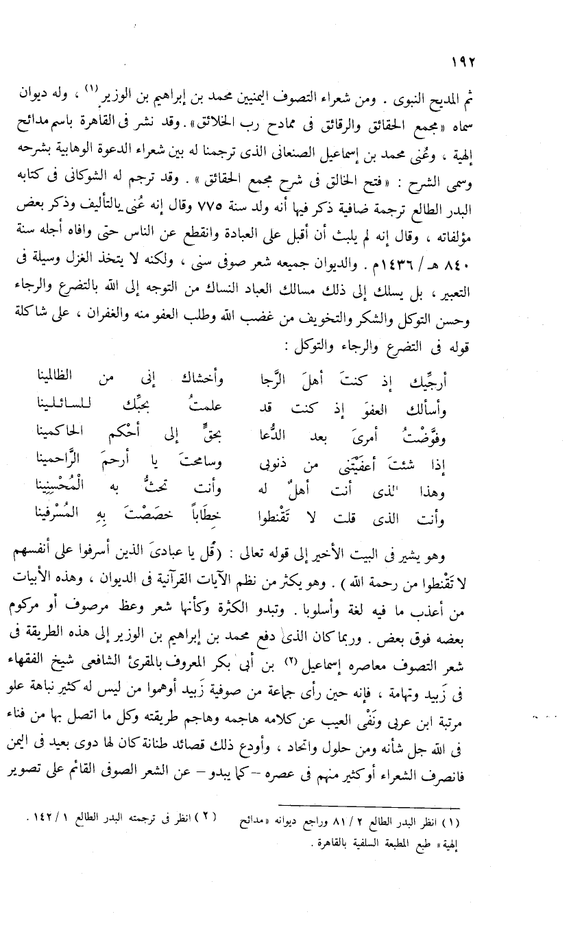 ثم المديح النبوى. ومن شعراء التصوف اليمنيين محمد بن إبراهيم بن الوزير (¬1)، وله ديوان سماه «مجمع الحقائق والرقائق فى ممادح رب الخلائق». وقد نشر فى القاهرة باسم مدائح إلهية، وعنى محمد بن إسماعيل الصنعانى الذى ترجمنا له بين شعراء الدعوة الوهابية بشرحه وسمى الشرح: «فتح الخالق فى شرح مجمع الحقائق». وقد ترجم له الشوكانى فى كتابه البدر الطالع ترجمة ضافية ذكر فيها أنه ولد سنة 775 وقال إنه عنى بالتأليف وذكر بعض مؤلفاته، وقال إنه لم يلبث أن أقبل على العبادة وانقطع عن الناس حتى وافاه أجله سنة 840 هـ/1436 م. والديوان جميعه شعر صوفى سنى، ولكنه لا يتخذ الغزل وسيلة فى التعبير، بل يسلك إلى ذلك مسالك العباد النساك من التوجه إلى الله بالتضرع والرجاء وحسن التوكل والشكر والتخويف من غضب الله وطلب العفو منه والغفران، على شاكلة قوله فى التضرع والرجاء والتوكل: