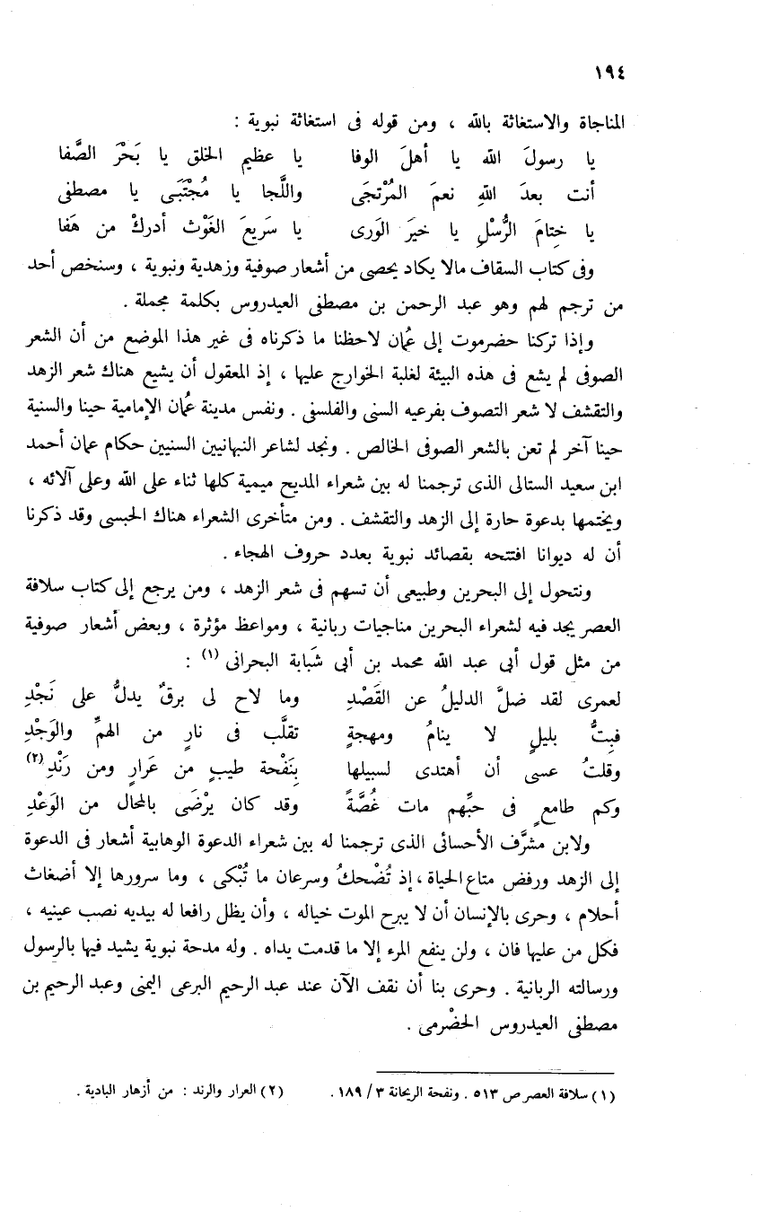 وإذا تركنا حضرموت إلى عمان لاحظنا ما ذكرناه فى غير هذا الموضع من أن الشعر الصوفى لم يشع فى هذه البيئة لغلبة الخوارج عليها، إذ المعقول أن يشيع هناك شعر الزهد والتقشف لا شعر التصوف بفرعيه السنى والفلسفى. ونفس مدينة عمان الإمامية حينا والسنية حينا آخر لم تعن بالشعر الصوفى الخالص. ونجد لشاعر النبهانيين السنيين حكام عمان أحمد ابن سعيد الستالى الذى ترجمنا له بين شعراء المديح ميمية كلها ثناء على الله وعلى آلائه، ويختمها بدعوة حارة إلى الزهد والتقشف. ومن متأخرى الشعراء هناك الحبسى وقد ذكرنا أن له ديوانا افتتحه بقصائد نبوية بعدد حروف الهجاء.