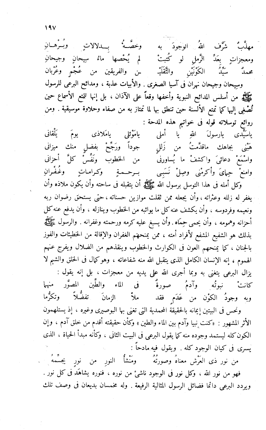 ونحس فى البيتين إيمانه بالحقيقة المحمدية التى تغنى بها البوصيرى وغيره، إذ يستلهمون الأثر المشهور: «كنت نبيا وآدم بين الماء والطين» وكأن حقيقته أقدم من خلق آدم، وإن الكون كله ليستمد وجوده منه كما يقول البرعى فى البيت الثانى، وكأنه مبدأ الحياة، الذى يسرى فى كيان الوجود كله. ويقول فيه مادحا: