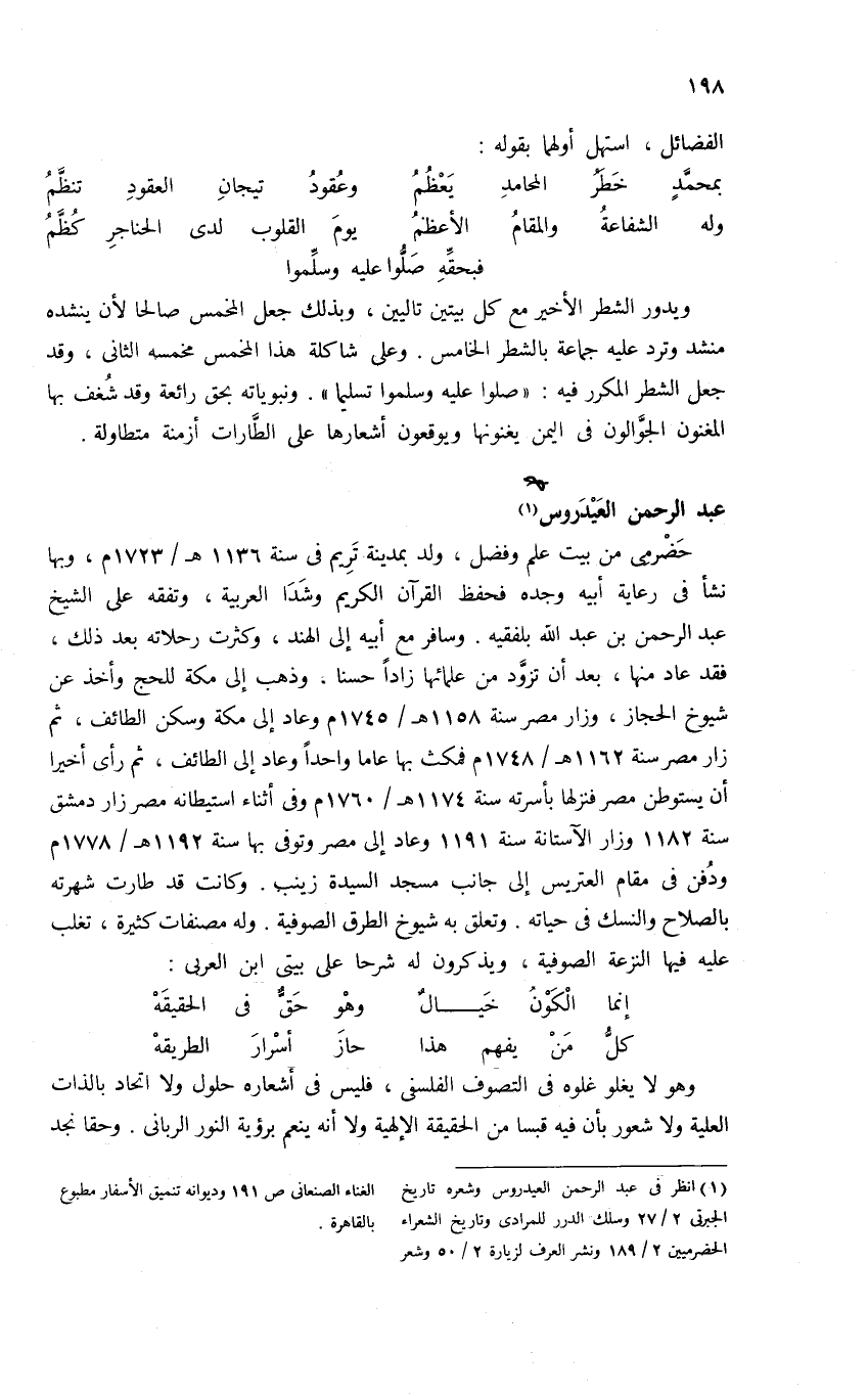 (¬1) انظر فى عبد الرحمن العيدروس وشعره تاريخ الجبرتى 2/ 27 وسلك الدرر للمرادى وتاريخ الشعراء الحضرميين 2/ 189 ونشر العرف لزيارة 2/ 50 وشعر الغناء الصنعانى ص 191 وديوانه تنميق الأسفار مطبوع بالقاهرة.