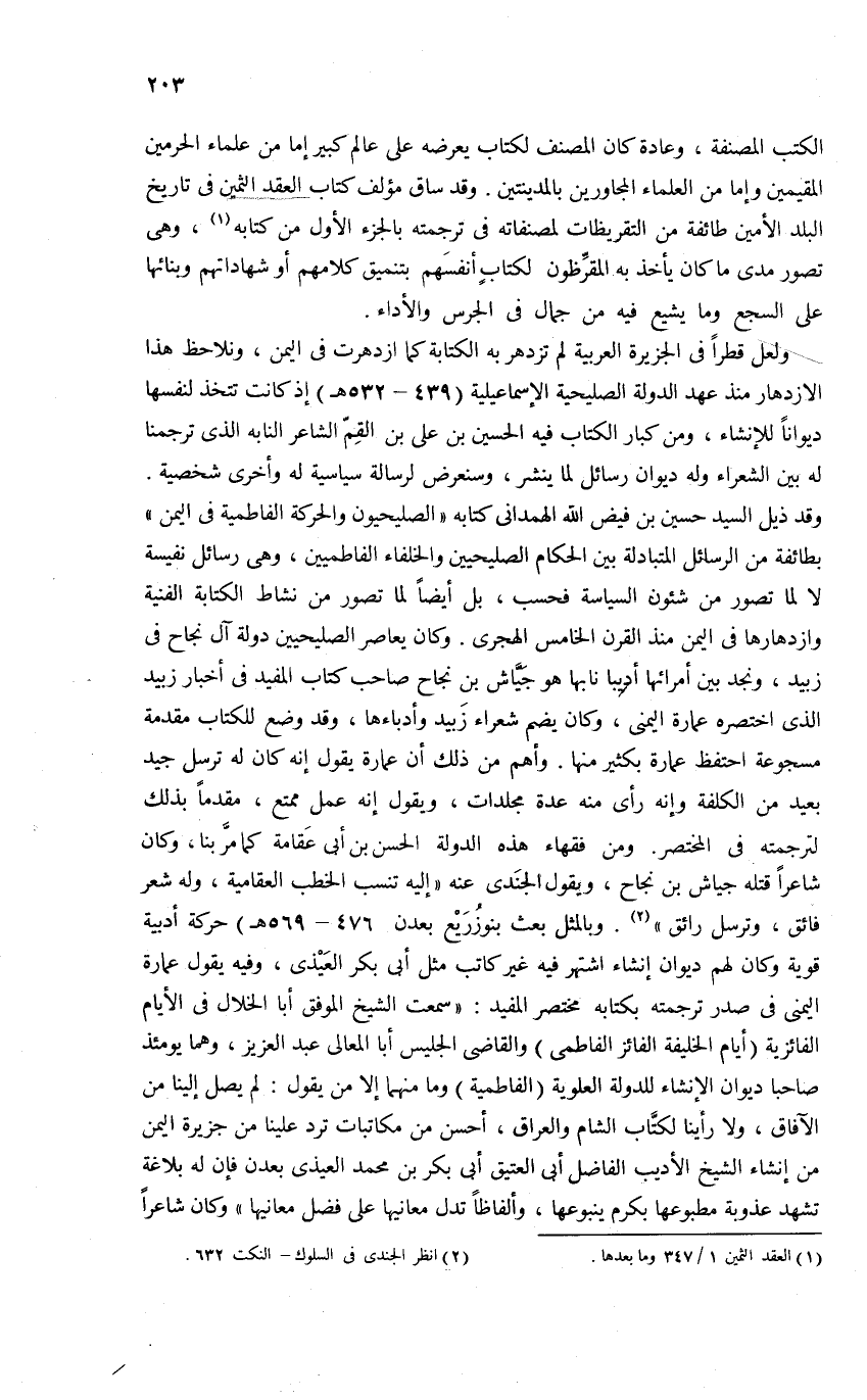 وقد ذيل السيد حسين بن فيض الله الهمدانى كتابه «الصليحيون والحركة الفاطمية فى اليمن» بطائفة من الرسائل المتبادلة بين الحكام الصليحيين والخلفاء الفاطميين، وهى رسائل نفيسة لا لما تصور من شئون السياسة فحسب، بل أيضا لما تصور من نشاط الكتابة الفنية وازدهارها فى اليمن منذ القرن الخامس الهجرى. وكان يعاصر الصليحيين دولة آل نجاح فى زبيد، ونجد بين أمرائها أديبا نابها هو جيّاش بن نجاح صاحب كتاب المفيد فى أخبار زبيد الذى اختصره عمارة اليمنى، وكان يضم شعراء زبيد وأدباءها، وقد وضع للكتاب مقدمة مسجوعة احتفظ عمارة بكثير منها. وأهم من ذلك أن عمارة يقول إنه كان له ترسل جيد بعيد من الكلفة وإنه رأى منه عدة مجلدات، ويقول إنه عمل ممتع، مقدما بذلك لترجمته فى المختصر. ومن فقهاء هذه الدولة الحسن بن أبى عقامة كما مرّ بنا، وكان شاعرا قتله جياش بن نجاح، ويقول الجندى عنه «إليه تنسب الخطب العقامية، وله شعر فائق، وترسل رائق» (¬2). وبالمثل بعث بنوزريع بعدن (476 - 569 هـ) حركة أدبية قوية وكان لهم ديوان إنشاء اشتهر فيه غير كاتب مثل أبى بكر العيذى، وفيه يقول عمارة اليمنى فى صدر ترجمته بكتابه مختصر المفيد: «سمعت الشيخ الموفق أبا الخلال فى الأيام الفائزية (أيام الخليفة الفائز الفاطمى) والقاضى الجليس أبا المعالى عبد العزيز، وهما يومئذ صاحبا ديوان الإنشاء للدولة العلوية (الفاطمية) وما منهما إلا من يقول: لم يصل إلينا من الآفاق، ولا رأينا لكتّاب الشام والعراق، أحسن من مكاتبات ترد علينا من جزيرة اليمن من إنشاء الشيخ الأديب الفاضل أبى العتيق أبى بكر بن محمد العيذى بعدن فإن له بلاغة تشهد عذوبة مطبوعها بكرم ينبوعها، وألفاظا تدل معانيها على فضل معانيها» وكان شاعرا