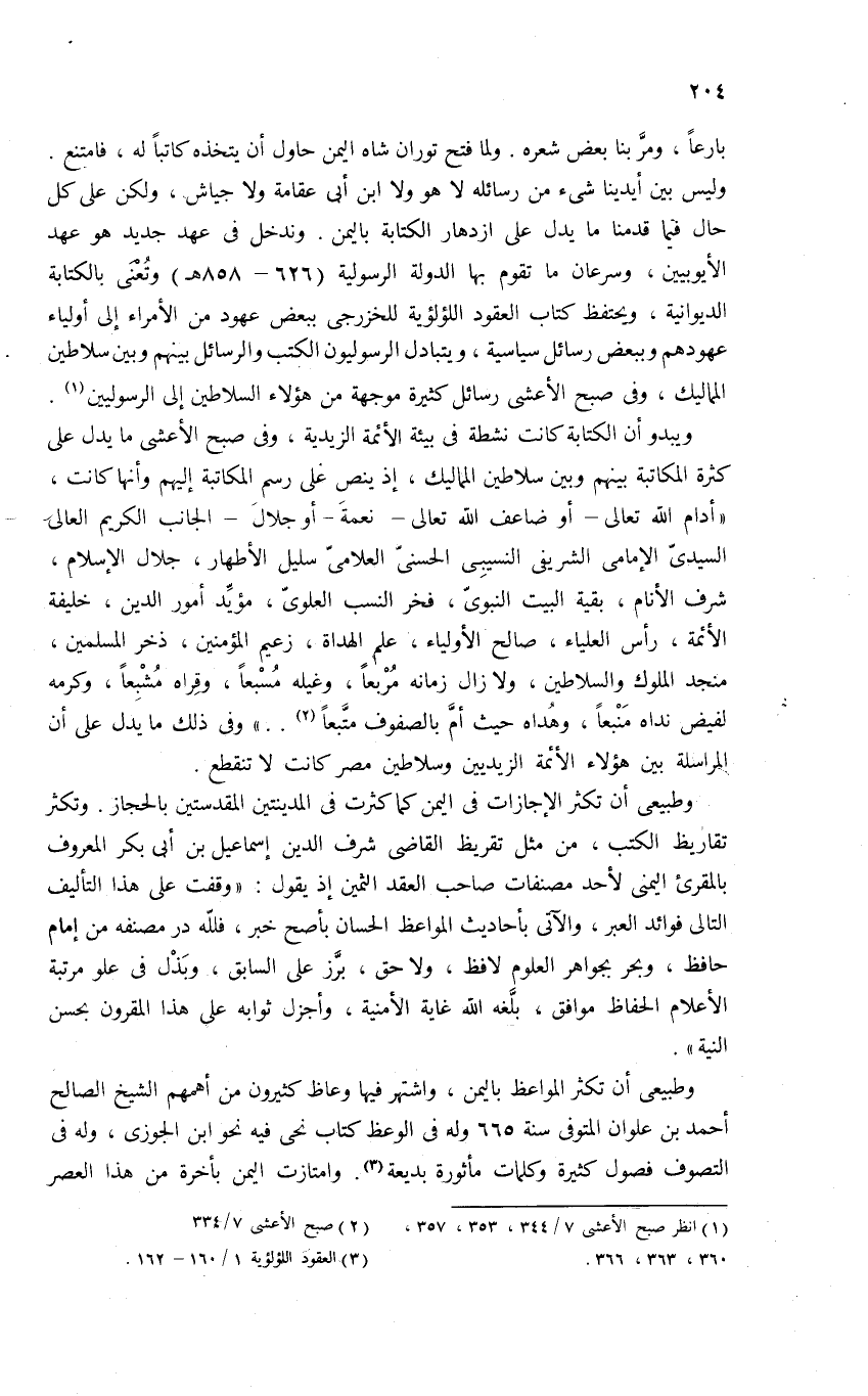 وليس بين أيدينا شئ من رسائله لا هو ولا ابن أبى عقامة ولا جياش، ولكن على كل حال فيما قدمنا ما يدل على ازدهار الكتابة باليمن. وندخل فى عهد جديد هو عهد الأيوبيين، وسرعان ما تقوم بها الدولة الرسولية (626 - 858 هـ) وتعنى بالكتابة الديوانية، ويحتفظ كتاب العقود اللؤلؤية للخزرجى ببعض عهود من الأمراء إلى أولياء عهودهم وببعض رسائل سياسية، ويتبادل الرسوليون الكتب والرسائل بينهم وبين سلاطين المماليك، وفى صبح الأعشى رسائل كثيرة موجهة من هؤلاء السلاطين إلى الرسوليين (¬1).