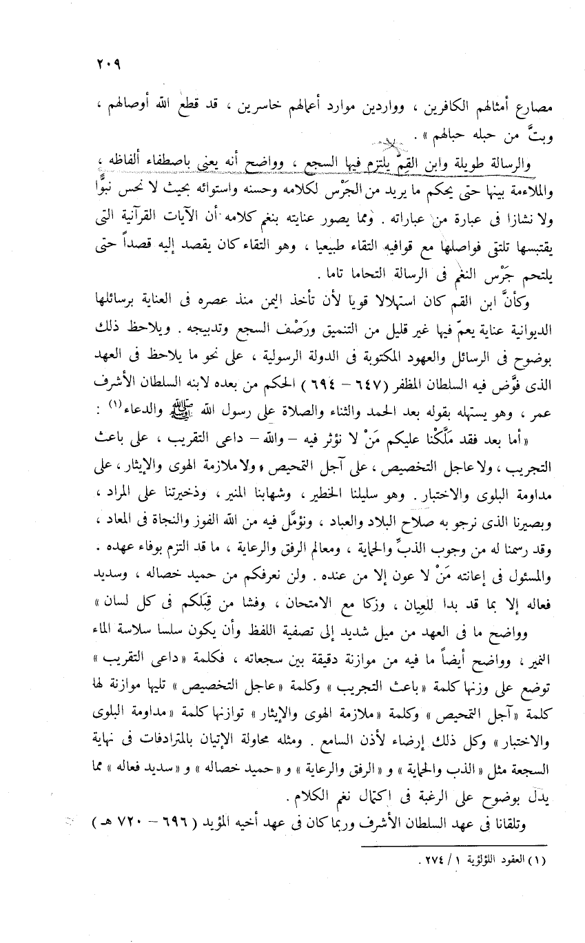وكأنّ ابن القم كان استهلالا قويا لأن تأخذ اليمن منذ عصره فى العناية برسائلها الديوانية عناية يعمّ فيها غير قليل من التنميق ورصف السجع وتدبيجه. ويلاحظ ذلك بوضوح فى الرسائل والعهود المكتوبة فى الدولة الرسولية، على نحو ما يلاحظ فى العهد الذى فوّض فيه السلطان المظفر (647 - 694) الحكم من بعده لابنه السلطان الأشرف عمر، وهو يستهله بقوله بعد الحمد والثناء والصلاة على رسول الله صلى الله عليه وسلم والدعاء (¬1):