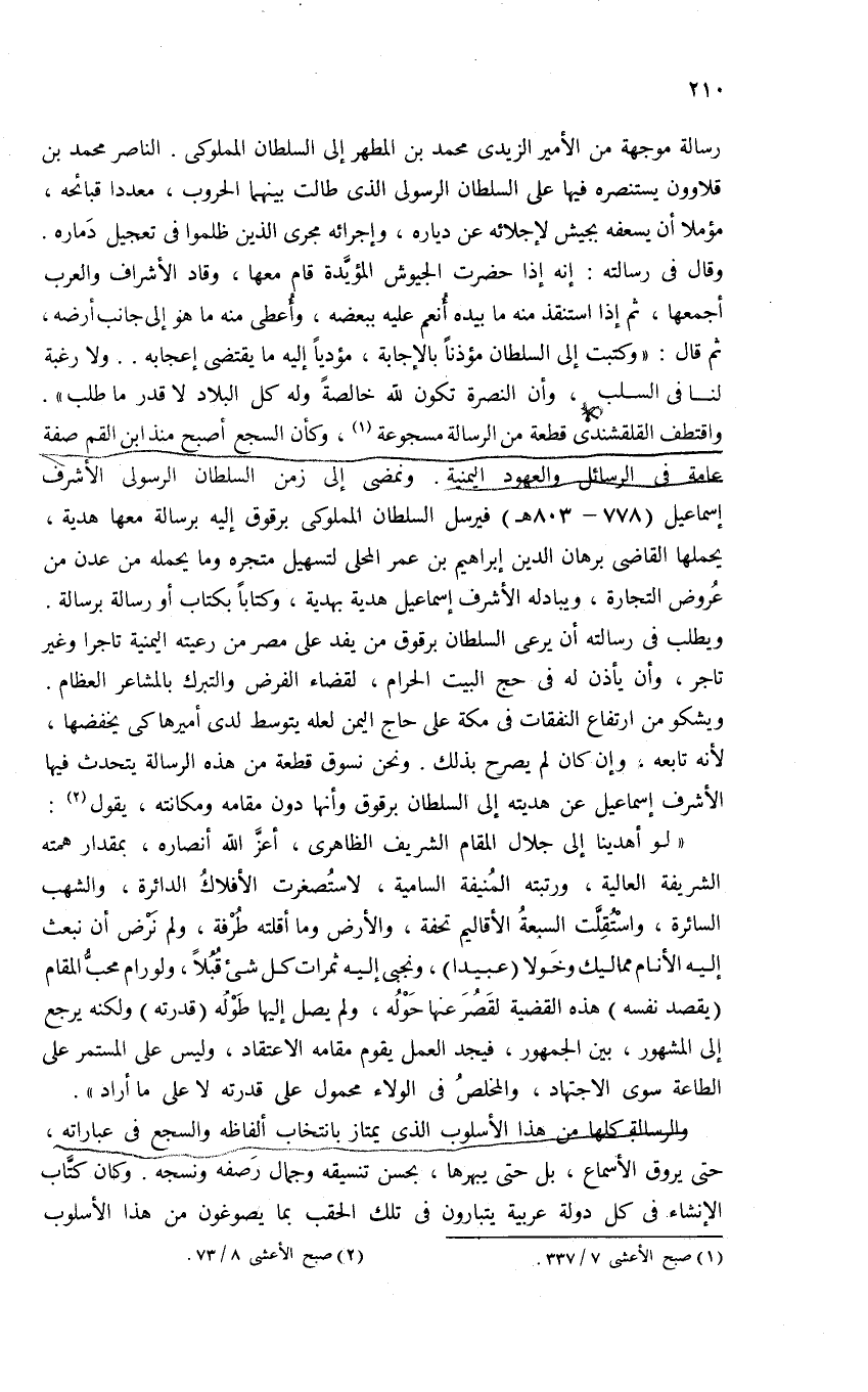 واقتطف القلقشندى قطعة من الرسالة مسجوعة (¬1)، وكأن السجع أصبح منذ ابن القم صفة عامة فى الرسائل والعهود اليمنية. ونمضى إلى زمن السلطان الرسولى الأشرف إسماعيل (778 - 803 هـ) فيرسل السلطان المملوكى برقوق إليه برسالة معها هدية، يحملها القاضى برهان الدين إبراهيم بن عمر المحلى لتسهيل متجره وما يحمله من عدن من عروض التجارة، ويبادله الأشرف إسماعيل هدية بهدية، وكتابا بكتاب أو رسالة برسالة.