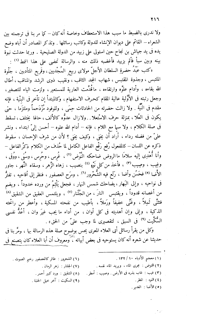 «كتب عبد حضرة السلطان الأجلّ مولاى ربيع المجديين، وقريع المتأدبين، جلوة الملتبس، وجذوة المقتبس، شهاب المجد الثاقب، ونقيب ذوى الرشد والمناقب، أطال الله بقاءه، وأدام علوّه وارتقاءه، ما قدّمت العارية للمستعير، ولزمت الياء للتصغير، وجعل رتبته فى الأوّلية عالية المقام كحرف الاستفهام، وكالمبتدأ إن تأخر فى البنية، فإنه مقدم فى النّيّة. ولا زالت حضرته من الحادثات حمى، وللوفود مزدحما وملتزما، حتى يكون فى العلا، بمنزلة حرف الاستعلا. . ولا زال عدوّه كالألف، حالها يختلف، تسقط فى صلة الكلام، ولا سيما مع اللام، فإنه-أدام الله علوه-أحسن إلىّ ابتداء، ونشر علىّ من فضله رداء، أراد أن يخفى، وكيف يخفى؟ لأن من شرف الإحسان، سقوط ذكره عن اللسان-كالمفعول رفع رفع الفاعل الكامل لما حذف من الكلام ذكر الفاعل- وأنا أهدى إليه سلاما ما الروض ضاحكه النّوض (¬2)، غرس، وحرس، وسقى، ووقى، وغيب، وصيب (¬3)، فأخذ من كل نوء (¬4) بنصيب، زهاه الزّهر، وسقاه النّهر، جاور الأضا (¬5) فحسن وأضا، رتع فيه الشّحرور (¬6)، ومرح العصفور، فنظر إلى أقاحيه، تفترّ فى نواحيه، وإلى البهار، يضاحك شمس النهار، فجعل يلثم من ورده خدودا، ويضم من أغصانه قدودا، ويقتبس النار، من الجلّنار (¬7)، ويلتمس العقيق من الشقيق (¬8) فتثنّى ثملا، وغنّى خفيفا ورملا، بأطيب من نفحته المسكية، وأعطر من رائحته الذكية، وإنى وإن أهديته فى كل أوان، من أداء ما يجب غير وان، أعدّ نفسى السّكّيت (¬9) فى السبق، لتقصيرى لما وجب علىّ من الحق».