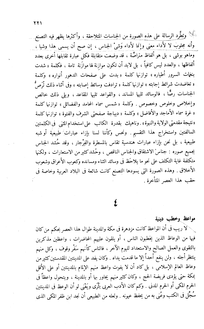 وتطّرد الرسالة على هذه الصورة من الجناسات المتلاحقة، وأكثرها يظهر فيه التصنع وأنه مجلوب لا لأداء معنى وإنما لأداء وشى الجناس، إن صح أن يسمى هذا وشيا، وما هو بوشى، بل هو ألفاظ متراصّة، قد وضعت متقابلة فكل عبارة تقابلها أخرى بعدد ألفاظها، والعدد ليس كافيا، بل لابد أن تكون موازنة لها موازنة تامة، فكلمة «شدت بنغمات السرور أطياره» توازنها كلمة «بدت على صفحات الدهور أنواره» وكلمة «تعاضدت شرائط إجابته» توازنها كلمة «ترادفت وسائط إصابته» وفى أثناء ذلك ترصّ الجناسات رصّا، فالوسائد تليها المساند، والقواعد تليها المقاعد، ويلى ذلك خالص وإخلاص وخلوص وخصوص. وكلمة «شمس سماء المحامد والفضائل» توازنها كلمة «غرة سماء الأماجد والأفاضل» وكلمة «ديباجة صفحتى الشرف والفتوة» توازنها كلمة «نتيجة مقدمتى الولاية والنبوة». وناهيك بقدرة الكاتب على استخدام المثنى فى الكلمتين السالفتين واستخراج هذا التقسيم. ونحس وكأننا لسنا بإزاء عبارات طبيعية أو شبه طبيعية، بل نحن بإزاء عبارات هندسية تقاس بالمسطرة والفرجار، وقد حشد الجناس بجميع صوره: جناس الاشتقاق والجناس الناقص، وحشد كثير من الاستعارات، ولكنها متكلفة غاية التكلف على نحو ما يلاحظ فى وسائد الثناء ومسانده وكعوب الأعراق وشعوب الأخلاق. وهذه الصورة التى يسودها التصنع كانت شائعة فى البلاد العربية وخاصة فى حقب هذا العصر المتأخرة.