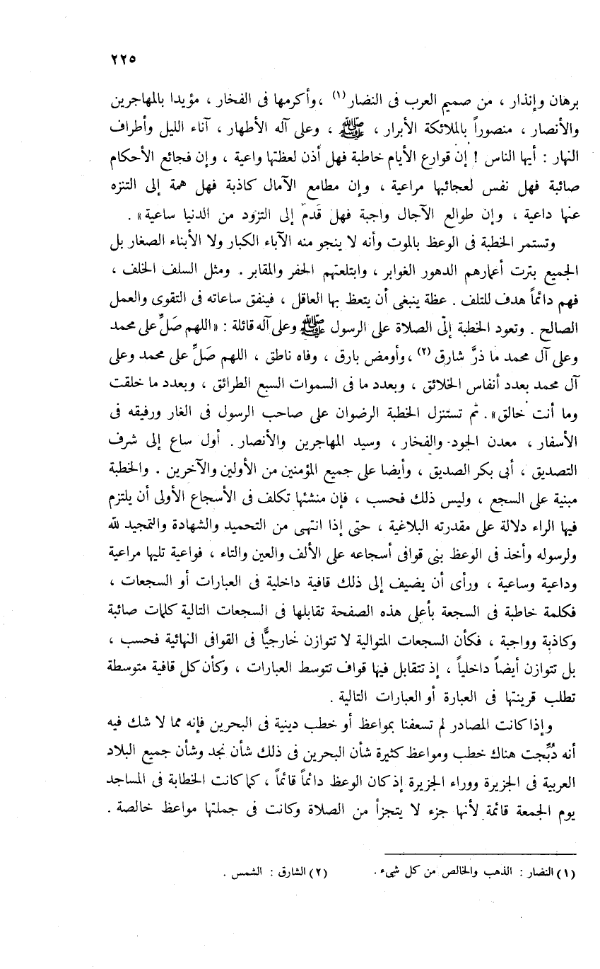 وتستمر الخطبة فى الوعظ بالموت وأنه لا ينجو منه الآباء الكبار ولا الأبناء الصغار بل الجميع بترت أعمارهم الدهور الغوابر، وابتلعتهم الحفر والمقابر. ومثل السلف الخلف، فهم دائما هدف للتلف. عظة ينبغى أن يتعظ بها العاقل، فينفق ساعاته فى التقوى والعمل الصالح. وتعود الخطبة إلى الصلاة على الرسول صلى الله عليه وسلم وعلى آله قائلة: «اللهم صلّ على محمد وعلى آل محمد ما ذرّ شارق (¬2)، وأومض بارق، وفاه ناطق، اللهم صلّ على محمد وعلى آل محمد بعدد أنفاس الخلائق، وبعدد ما فى السموات السبع الطرائق، وبعدد ما خلقت وما أنت خالق». ثم تستنزل الخطبة الرضوان على صاحب الرسول فى الغار ورفيقه فى الأسفار، معدن الجود والفخار، وسيد المهاجرين والأنصار. أول ساع إلى شرف التصديق، أبى بكر الصديق، وأيضا على جميع المؤمنين من الأولين والآخرين. والخطبة مبنية على السجع، وليس ذلك فحسب، فإن منشئها تكلف فى الأسجاع الأولى أن يلتزم فيها الراء دلالة على مقدرته البلاغية، حتى إذا انتهى من التحميد والشهادة والتمجيد لله ولرسوله وأخذ فى الوعظ بنى قوافى أسجاعه على الألف والعين والتاء، فواعية تليها مراعية وداعية وساعية، ورأى أن يضيف إلى ذلك قافية داخلية فى العبارات أو السجعات، فكلمة خاطبة فى السجعة بأعلى هذه الصفحة تقابلها فى السجعات التالية كلمات صائبة وكاذبة وواجبة، فكأن السجعات المتوالية لا تتوازن خارجيّا فى القوافى النهائية فحسب، بل تتوازن أيضا داخليا، إذ تتقابل فيها قواف تتوسط العبارات، وكأن كل قافية متوسطة تطلب قرينتها فى العبارة أو العبارات التالية.