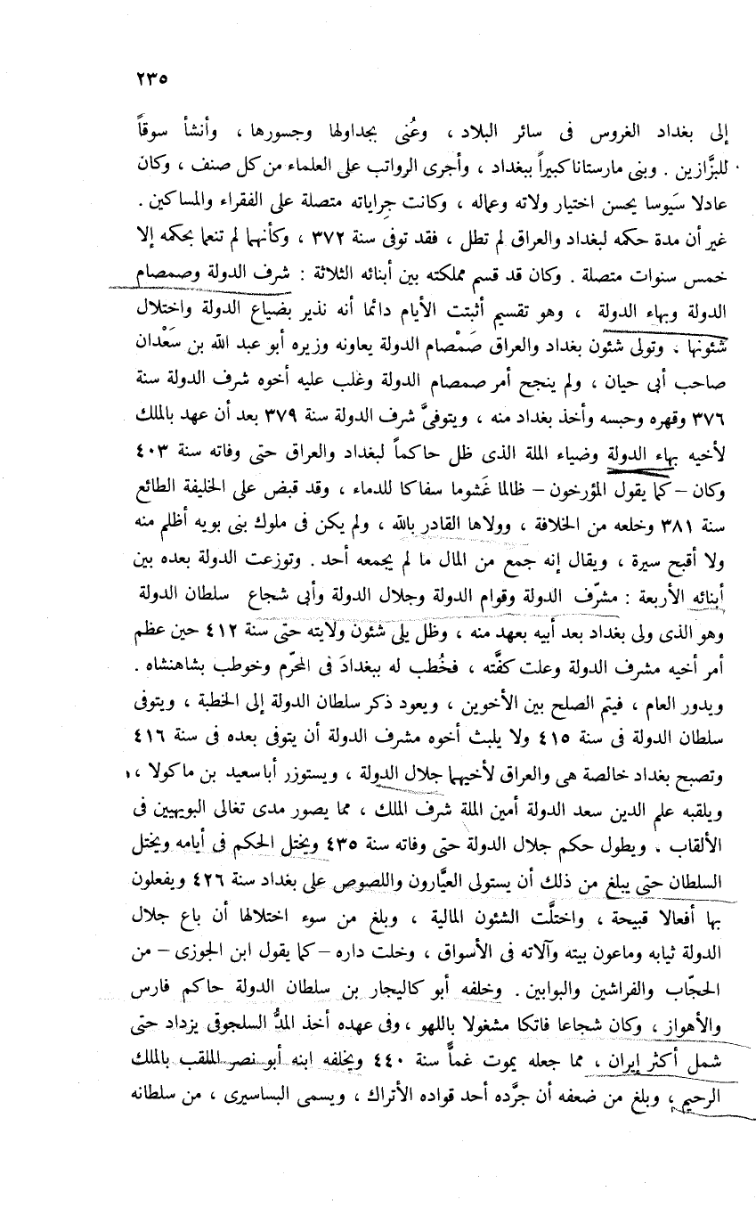 غير أن مدة حكمه لبغداد والعراق لم تطل، فقد توفى سنة 372، وكأنهما لم تنعما بحكمه إلا خمس سنوات متصلة. وكان قد قسم مملكته بين أبنائه الثلاثة: شرف الدولة وصمصام الدولة وبهاء الدولة، وهو تقسيم أثبتت الأيام دائما أنه نذير بضياع الدولة واختلال شئونها. وتولى شئون بغداد والعراق صمصام الدولة يعاونه وزيره أبو عبد الله بن سعدان صاحب أبى حيان، ولم ينجح أمر صمصام الدولة وغلب عليه أخوه شرف الدولة سنة 376 وقهره وحبسه وأخذ بغداد منه، ويتوفّى شرف الدولة سنة 379 بعد أن عهد بالملك لأخيه بهاء الدولة وضياء الملة الذى ظل حاكما لبغداد والعراق حتى وفاته سنة 403 وكان-كما يقول المؤرخون-ظالما غشوما سفاكا للدماء، وقد قبض على الخليفة الطائع سنة 381 وخلعه من الخلافة، وولاها القادر بالله، ولم يكن فى ملوك بنى بويه أظلم منه ولا أقبح سيرة، ويقال إنه جمع من المال ما لم يجمعه أحد. وتوزعت الدولة بعده بين أبنائه الأربعة: مشرّف الدولة وقوام الدولة وجلال الدولة وأبى شجاع سلطان الدولة وهو الذى ولى بغداد بعد أبيه بعهد منه، وظل يلى شئون ولايته حتى سنة 412 حين عظم أمر أخيه مشرف الدولة وعلت كفّته، فخطب له ببغداد فى المحرّم وخوطب بشاهنشاه.