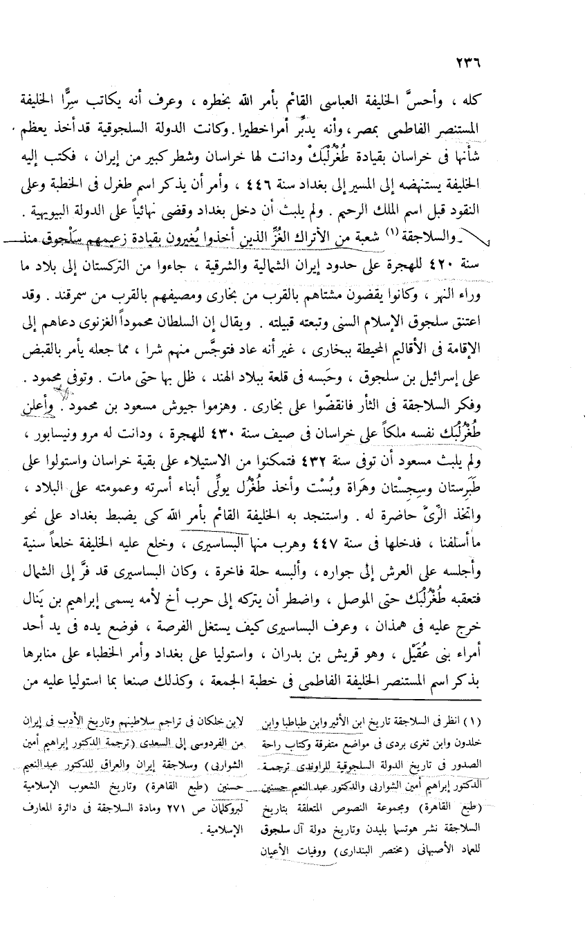 (¬1) انظر فى السلاجقة تاريخ ابن الأثير وابن طباطبا وابن خلدون وابن تغرى بردى فى مواضع متفرقة وكتاب راحة الصدور فى تاريخ الدولة السلجوقية للراوندى ترجمة الدكتور إبراهيم أمين الشواربى والدكتور عبد النعيم حسنين (طبع القاهرة) ومجموعة النصوص المتعلقة بتاريخ السلاجقة نشر هوتسما بليدن وتاريخ دولة آل سلجوق للعماد الأصبهانى (مختصر البندارى) ووفيات الأعيان لابن خلكان فى تراجم سلاطينهم وتاريخ الأدب فى إيران من الفردوسى إلى السعدى (ترجمة الدكتور إبراهيم أمين الشواربى) وسلاجقة إيران والعراق للدكتور عبد النعيم حسنين (طبع القاهرة) وتاريخ الشعوب الإسلامية لبروكلمان ص 271 ومادة السلاجقة فى دائرة المعارف الإسلامية.