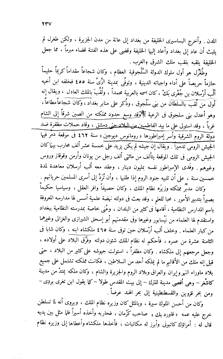 وطغرل هو أول ملوك الدولة السّلجوقية العظام، وكان شجاعا مقداما كريما حليما حازما حريصا على أداء واجباته الدينية، وتوفّى بمدينة الرّىّ سنة 455 فخلفه ابن أخيه ألب أرسلان بن جغرى بك، كان اسمه بالعربية محمدا، ولقّب بالملك العادل، ويقال إنه أول من لقب بالسلطان من بنى سلجوق، وذكر على منابر بغداد، وكان شجاعا مطاعا، وهو أعدل بنى سلجوق فى الرعية، وقد وسع حدود مملكته من الصين شرقا إلى الشام غربا، وقد استولى على ما بيد الفاطميين من البلاد حتى دمشق، وقاد حملات مظفرة ضد دولة الروم الشرقية وأسر إمبراطورها «رومانوس ديوجين» سنة 462 فى موقعة دمّر فيها الجيش الرومى تدميرا. ويقال إن جيشه لم يكن يزيد على خمسة عشر ألف محارب بينما كان الجيش الرومى فى تلك الموقعة يتألف من مائتى ألف رجل من يونان وأرمن وقوقاز وروس وغيرهم. وفدى الإمبراطور نفسه بمليون دينار، وعقد معه ألب أرسلان معاهدة لمدة خمسين سنة، على أن تلبيه جنود الروم إذا طلبها، وأن تردّ إلى أسرى المسلمين حرياتهم.