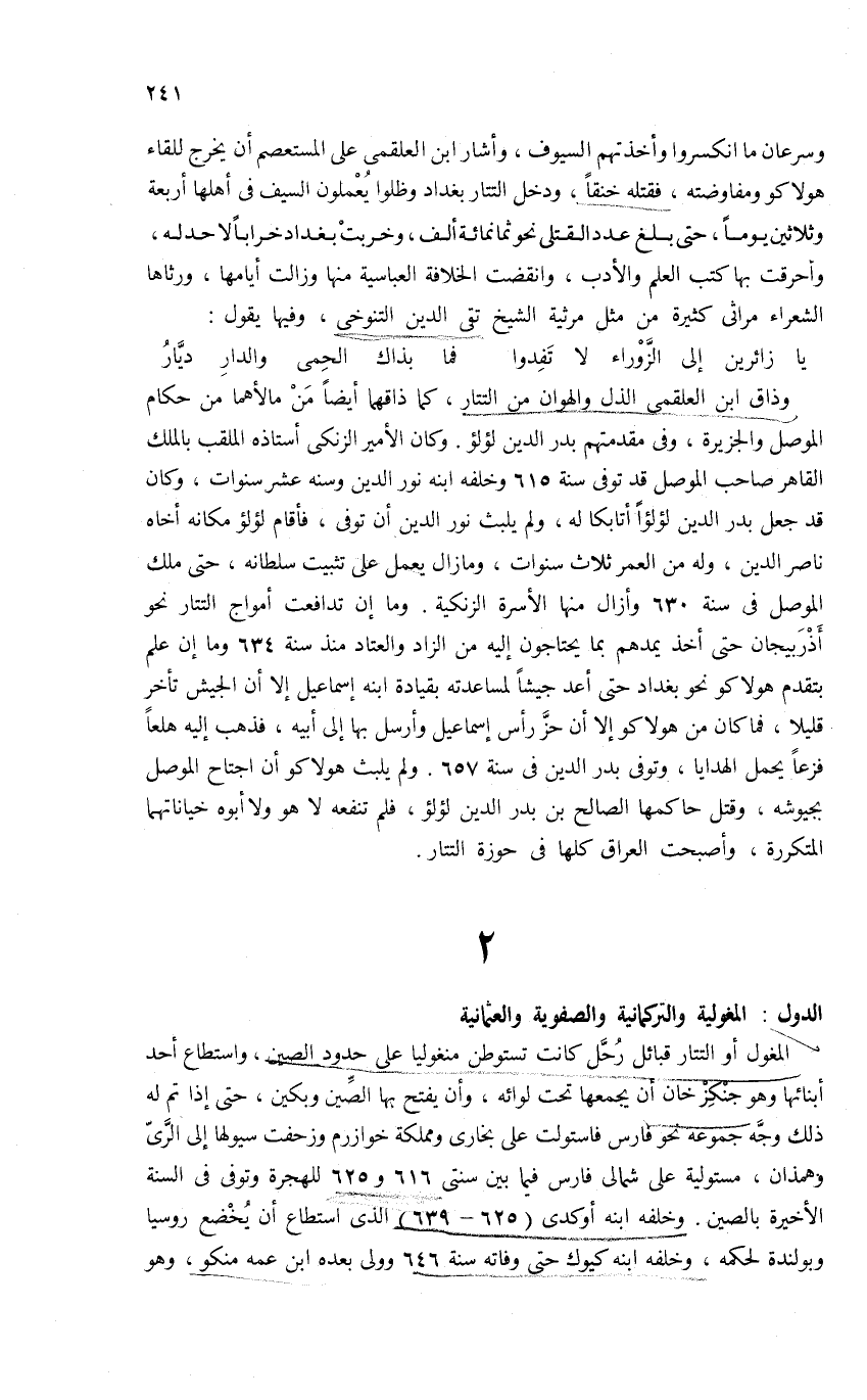 المغول أو التتار قبائل رحّل كانت تستوطن منغوليا على حدود الصين، واستطاع أحد أبنائها وهو جنكز خان أن يجمعها تحت لوائه، وأن يفتح بها الصّين وبكين، حتى إذا تم له ذلك وجّه جموعه نحو فارس فاستولت على بخارى ومملكة خوازرم وزحفت سيولها إلى الرّىّ وهمذان، مستولية على شمالى فارس فيما بين سنتى 616 و 625 للهجرة وتوفى فى السنة الأخيرة بالصين. وخلفه ابنه أوكدى (625 - 639) الذى استطاع أن يخضع روسيا وبولندة لحكمه، وخلفه ابنه كيوك حتى وفاته سنة 646 وولى بعده ابن عمه منكو، وهو
