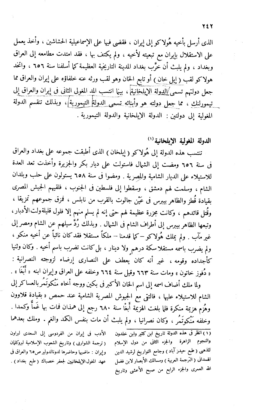 (¬1) انظر فى هذه الدولة تاريخ ابن كثير وابن خلدون والنجوم الزاهرة والجزء الثانى من دول الإسلام للذهبى (طبع حيدر آباد) وجامع التواريخ لرشيد الدين الهمدانى (الترجمة العربية) ومسالك الأبصار لابن فضل الله العمرى والجزء الرابع من صبح الأعشى وتاريخ الأدب فى إيران من الفردوسى إلى السعدى لبراون (ترجمة الشواربى) وتاريخ الشعوب الإسلامية لبروكلمان وإيران: ماضيها وحاضرها لدونالدولير ص 65 والعراق فى عهد المغول الإيلخانيين لجعفر خصباك (طبع بغداد).