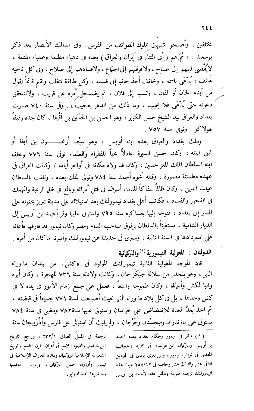 (¬1) انظر فى تيمور وحكام بغداد بعده احمد بن أويس والتركمان ابن عريشاه فى كتابه «عجائب المقدور فى نوائب تيمور» وابن تغرى بردى فى الجزءين الثانى عشر والثالث عشر وخاصة فى 12/ 254 حيث عقد لتيمور لنك ترجمة طويلة وبالمثل عقد لأحمد بن أويس ترجمة فى المنهل الصافى 1/ 232، وراجع تاريخ ابن خلدون والضوء اللامع فى أعيان القرن التاسع وتاريخ الشعوب الإسلامية ليروكلمان ودائرة المعارف الإسلامية فى تيمور وأوزون حسن التركمانى، وإيران: ماضيها وحاضرها لدونالدولير.