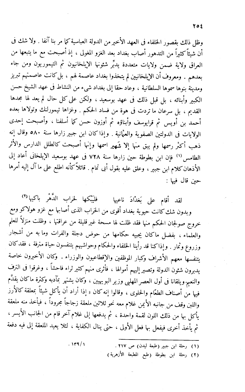 وظل ذلك بقصور الخلفاء فى العهد الأخير من الدولة العباسية كما مر بنا آنفا. ولا شك فى أن شيئا كثيرا من التدهور أصاب بغداد بعد الغزو المغولى، إذ أصبحت مع ما يتبعها من العراق ولاية ضمن ولايات متعددة يدبّر شئونها الإيلخانيون ثم التيموريون ومن جاء بعدهم. ومعروف أن الإيلخانيين لم يتخذوا بغداد عاصمة لهم، بل كانت عاصمتهم تبريز ومدينة بنوها سموها السلطانية، وعاد حقا إلى بغداد شئ من النشاط فى عهد الشيخ حسن الكبير وأبنائه، بل قبل ذلك فى عهد بوسعيد، ولكن على كل حال لم يعد لها مجدها القديم، بل سرعان ما تردت فى هوة من فساد الحكم. وغزاها تيمور لنك وتولاها بعده أحمد بن أويس ثم قرا يوسف وأبناؤه ثم أوزون حسن كما أسلفنا، وأصبحت إحدى الولايات فى الدولتين الصفوية والعثمانية. وإذا كان ابن جبير زارها سنة 580 وقال إنه ذهب أكثر رسمها ولم يبق منها إلا شهير اسمها وإنها أصبحت كالطلل الدارس والأثر الطامس (¬1) فإن ابن بطوطة حين زارها سنة 728 فى عهد بوسعيد الإيلخانى أعاد إلى الأذهان كلام ابن جبير، وعلق عليه بقول أبى تمام. قائلا كأنه اطلع على ما آل إليه أمرها حين قال فيها: