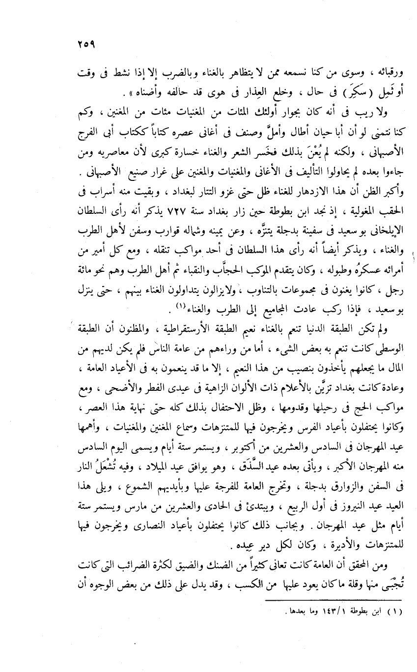 وأكبر الظن أن هذا الازدهار للغناء ظل حتى غزو التتار لبغداد، وبقيت منه أسراب فى الحقب المغولية، إذ نجد ابن بطوطة حين زار بغداد سنة 727 يذكر أنه رأى السلطان الإيلخانى بو سعيد فى سفينة بدجلة يتنزّه، وعن يمينه وشماله قوارب وسفن لأهل الطرب والغناء، ويذكر أيضا أنه رأى هذا السلطان فى أحد مواكب تنقله، ومع كل أمير من أمرائه عسكره وطبوله، وكان يتقدم الموكب الحجاّب والنقباء ثم أهل الطرب وهم نحو مائة رجل، كانوا يغنون فى مجموعات بالتناوب، ولا يزالون يتداولون الغناء بينهم، حتى ينزل بو سعيد، فإذا ركب عادت المجاميع إلى الطرب والغناء (¬1).