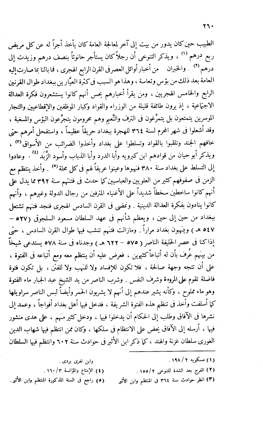 الطبيب حين كان يدور من بيت إلى آخر لمعالجة العامة كان يأخذ أجرا له عن كل مريض ربع درهم (¬1)، ويذكر التنوخى أن رجلا كان يستأجر حانوتا بنصف درهم وزيدت إلى درهم (¬2). والخبران من أخبار أوائل العصر فى القرن الرابع الهجرى، فما بالنا بما صارت إليه العامة بعد ذلك من بؤس وتعاسة، وهذا هو السبب فى كثرة العيّارين ببغداد طوال القرنين الرابع والخامس الهجريين، ومن يقرأ أخبارهم يحس أنهم كانوا يستشعرون فكرة العدالة الاجتماعية، إذ يرون طائفة قليلة من الوزراء والقواد وكبار الموظفين والإقطاعيين والتجار الموسرين يتمتعون بل يتمرّغون فى الترف والنّعيم وهم محرومون يتجرّعون البؤس والمسغبة، وقد أشعلوا فى شهر المحرم لسنة 364 للهجرة ببغداد حريقا عظيما، واستفحل أمرهم حتى خافهم الجند وتلقبوا بالقواد وتسلطوا على بغداد وأخذوا الضرائب من الأسواق (¬3)، ويذكر أبو حيان من قوادهم ابن كبرويه وأبا الدرد وأبا الذباب وأسود الزّبد (¬4). وعادوا إلى التسلط على بغداد سنة 380 فنهبوها وعينوا عريفا لهم فى كل محلة (¬5). وأخذ ينتظم مع الزمن فى صفوفهم كثير من العلويين والعباسيين كما حدث فى فتنتهم سنة 392 مما يدل على أنهم كانوا ساخطين سخطا شديدا على الأغنياء المترفين من رجال الدولة وغيرهم، وأنهم كانوا ينادون بفكرة العدالة الدينية. ونمضى فى القرن السادس الهجرى فنجد فتنهم تشتعل ببغداد من حين إلى حين، ويعظم شأنهم فى عهد السلطان مسعود السلجوقى (527 - 547 هـ) وينهبون بغداد مرارا. وما زالت فتنهم تنشب فيها طوال القرن السادس، حتى إذا كنا فى عصر الخليفة الناصر (575 - 622 هـ) وجدناه فى سنة 578 يستدعى شيخا من بينهم عرف بأن له أتباعا كثيرين، فعرض عليه أن ينتظم معه ومع أتباعه فى الفتوة، على أن تتجه وجهة صالحة، فلا تكون للإفساد ولا للنهب ولا للفتن، بل تكون فتوة فاضلة تقوم على المروءة وشرف النفس. وشرب الناصر من يد الشيخ عبد الجبار ماء الفتوة وهو ماء مملوح، وكأنه يشير عندهم إلى أنهم لا يشربون الخمر وأيضا لبس الناصر سراويلها كما أسلفت وأخذ فى تنظيم هذه الفتوة الشريفة، فدخل فيها أهل بغداد أفواجا، وعمد إلى نشرها فى الآفاق وطلب إلى الحكام أن يدخلوا فيها، ودخل كثير منهم، على هدى منشور فيها، أرسله إلى الآفاق يحض على الانتظام فى سلكها، وكان ممن انتظم فيها شهاب الدين الغورى سلطان غزنة والهند، كما ذكر ابن الأثير فى حوادث سنة 602 وانتظم فيها السلطان