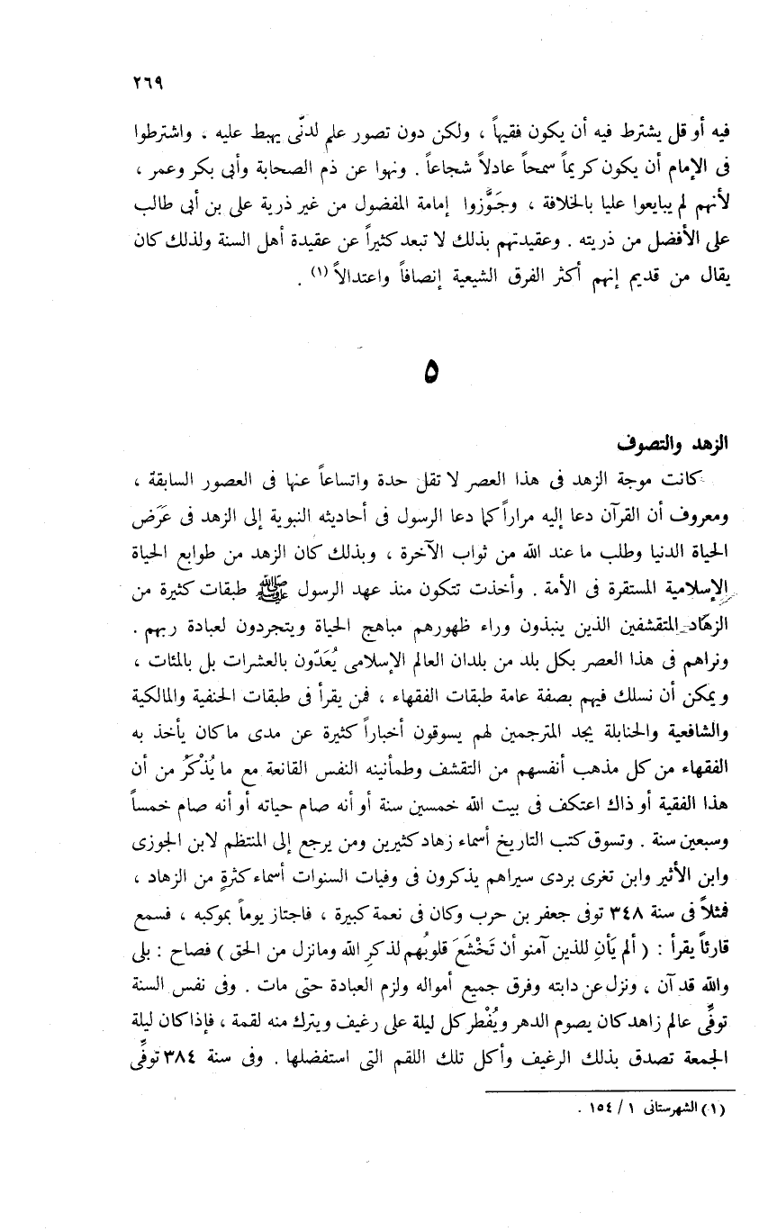 ونراهم فى هذا العصر بكل بلد من بلدان العالم الإسلامى يعدّون بالعشرات بل بالمئات، ويمكن أن نسلك فيهم بصفة عامة طبقات الفقهاء، فمن يقرأ فى طبقات الحنفية والمالكية والشافعية والحنابلة يجد المترجمين لهم يسوقون أخبارا كثيرة عن مدى ما كان يأخذ به الفقهاء من كل مذهب أنفسهم من التقشف وطمأنينه النفس القانعة مع ما يذكر من أن هذا الفقيه أو ذاك اعتكف فى بيت الله خمسين سنة أو أنه صام حياته أو أنه صام خمسا وسبعين سنة. وتسوق كتب التاريخ أسماء زهاد كثيرين ومن يرجع إلى المنتظم لابن الجوزى وابن الأثير وابن تغرى بردى سيراهم يذكرون فى وفيات السنوات أسماء كثرة من الزهاد، فمثلا فى سنة 348 توفى جعفر بن حرب وكان فى نعمة كبيرة، فاجتاز يوما بموكبه، فسمع قارئا يقرأ: {(أَلَمْ يَأْنِ لِلَّذِينَ آمَنُوا أَنْ تَخْشَعَ قُلُوبُهُمْ لِذِكْرِ اللهِ وَما نَزَلَ مِنَ الْحَقِّ)} فصاح: بلى والله قد آن، ونزل عن دابته وفرق جميع أمواله ولزم العبادة حتى مات. وفى نفس السنة توفّى عالم زاهد كان يصوم الدهر ويفطر كل ليلة على رغيف ويترك منه لقمة، فإذا كان ليلة الجمعة تصدق بذلك الرغيف وأكل تلك اللقم التى استفضلها. وفى سنة 384 توفّى