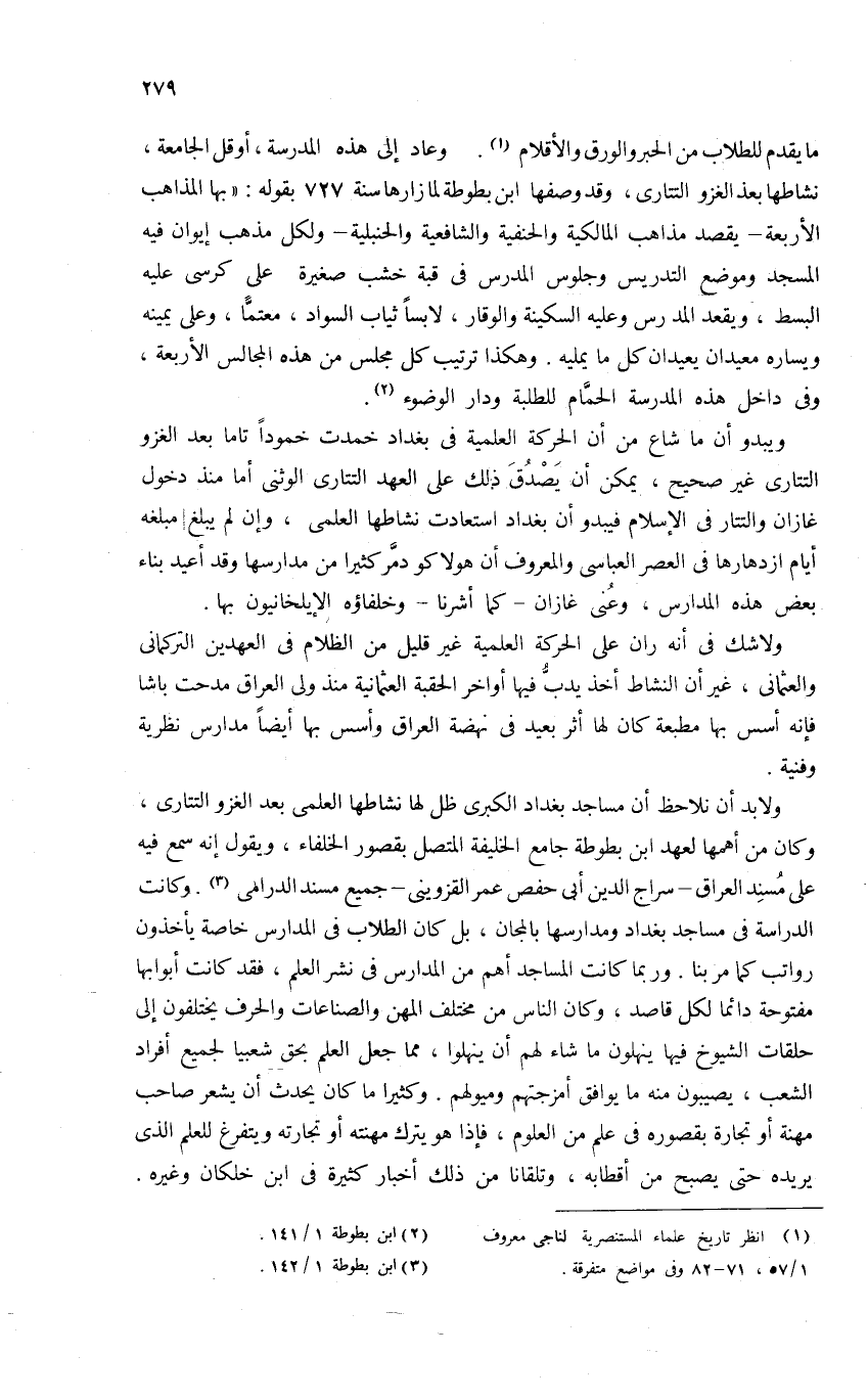 ويبدو أن ما شاع من أن الحركة العلمية فى بغداد خمدت خمودا تاما بعد الغزو التتارى غير صحيح، يمكن أن يصدق ذلك على العهد التتارى الوثنى أما منذ دخول غازان والتتار فى الإسلام فيبدو أن بغداد استعادت نشاطها العلمى، وإن لم يبلغ مبلغه أيام ازدهارها فى العصر العباسى والمعروف أن هولاكو دمّر كثيرا من مدارسها وقد أعيد بناء بعض هذه المدارس، وعنى غازان-كما أشرنا-وخلفاؤه الإيلخانيون بها.